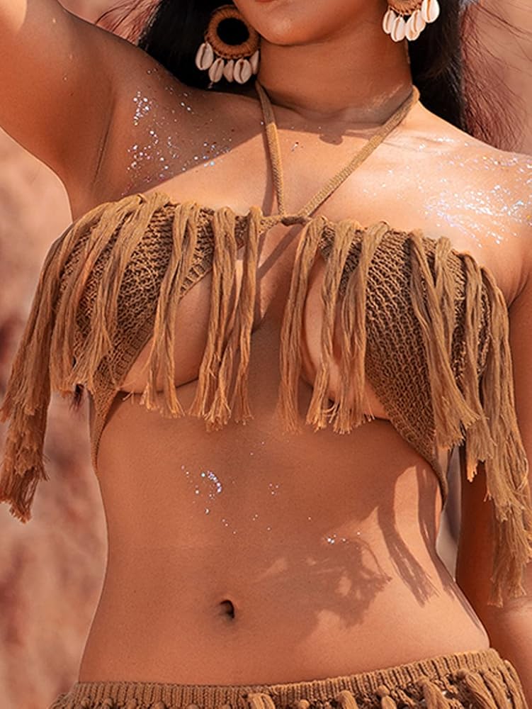 - Features: halter, sleeveless, backless, fringe, tie back, crochet, 2 piece set