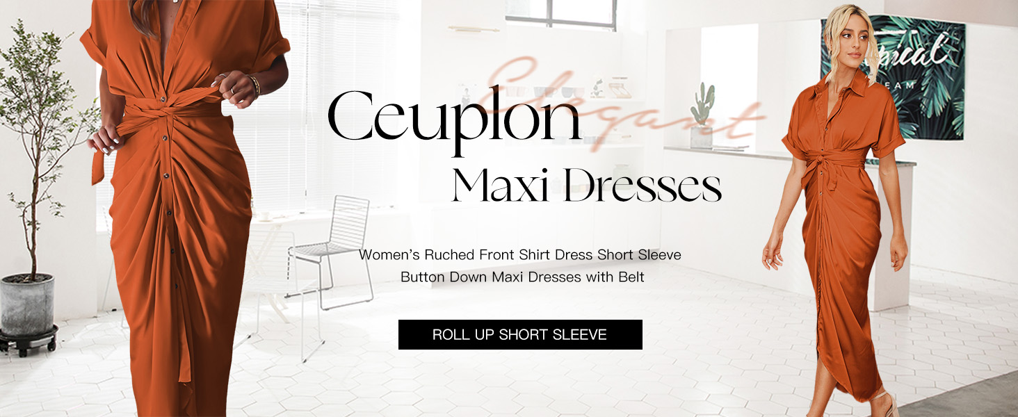 Ceuplon Women's Ruched Front Shirt Dress Short Sleeve Button Down Maxi Dresses with Belt