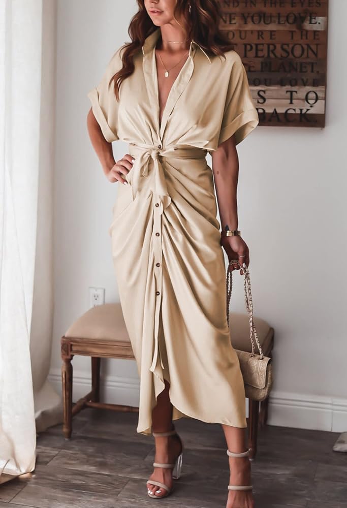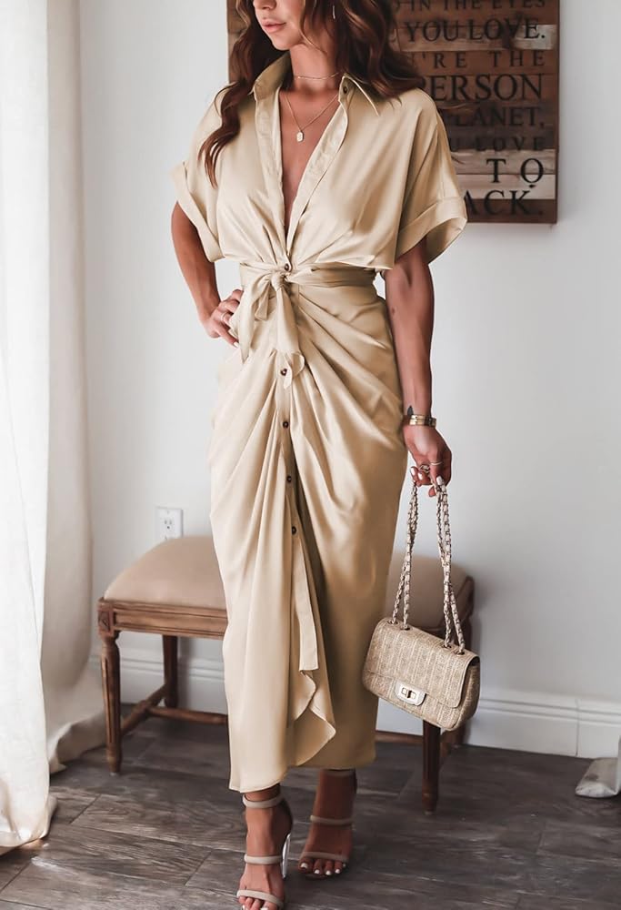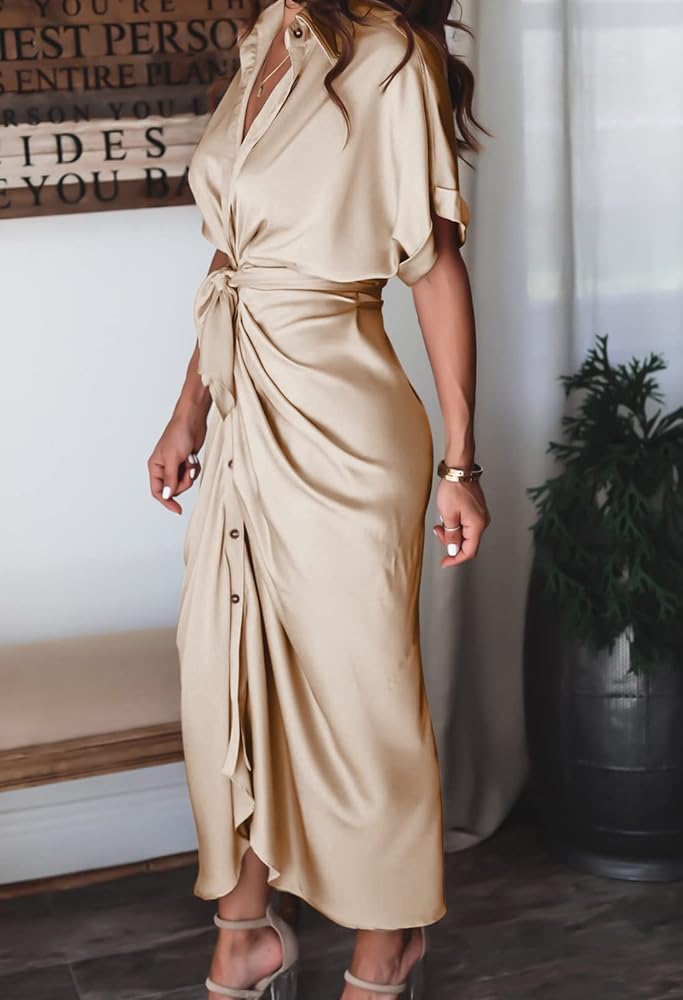 - Elegant ruched button down maxi shirts dress long satin dress, Features: V neck, roll up short sleeve, irregular hem, empire waist
