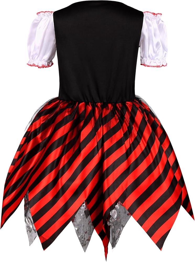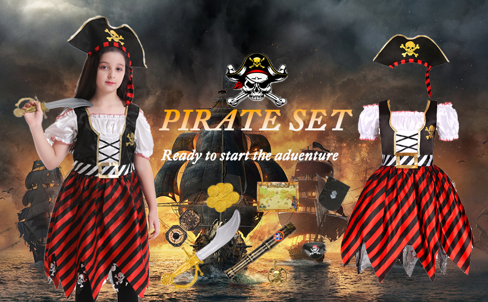 Full Pirate Ensemble: Our girls pirate costume for kids comes complete with all the essentials for an epic adventure, including a pirate costume, treasure map, compass, earrings, pirate eye patch, shiny gold coins, a money bag, telescope, and a machete prop.