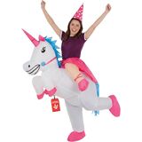 Includes unicorn blow up suit & air pump combo. Just step in, zip up, switch on the fan, and you're ready for fun! The fan will keep you inflated for around 4 hours (batteries not included).