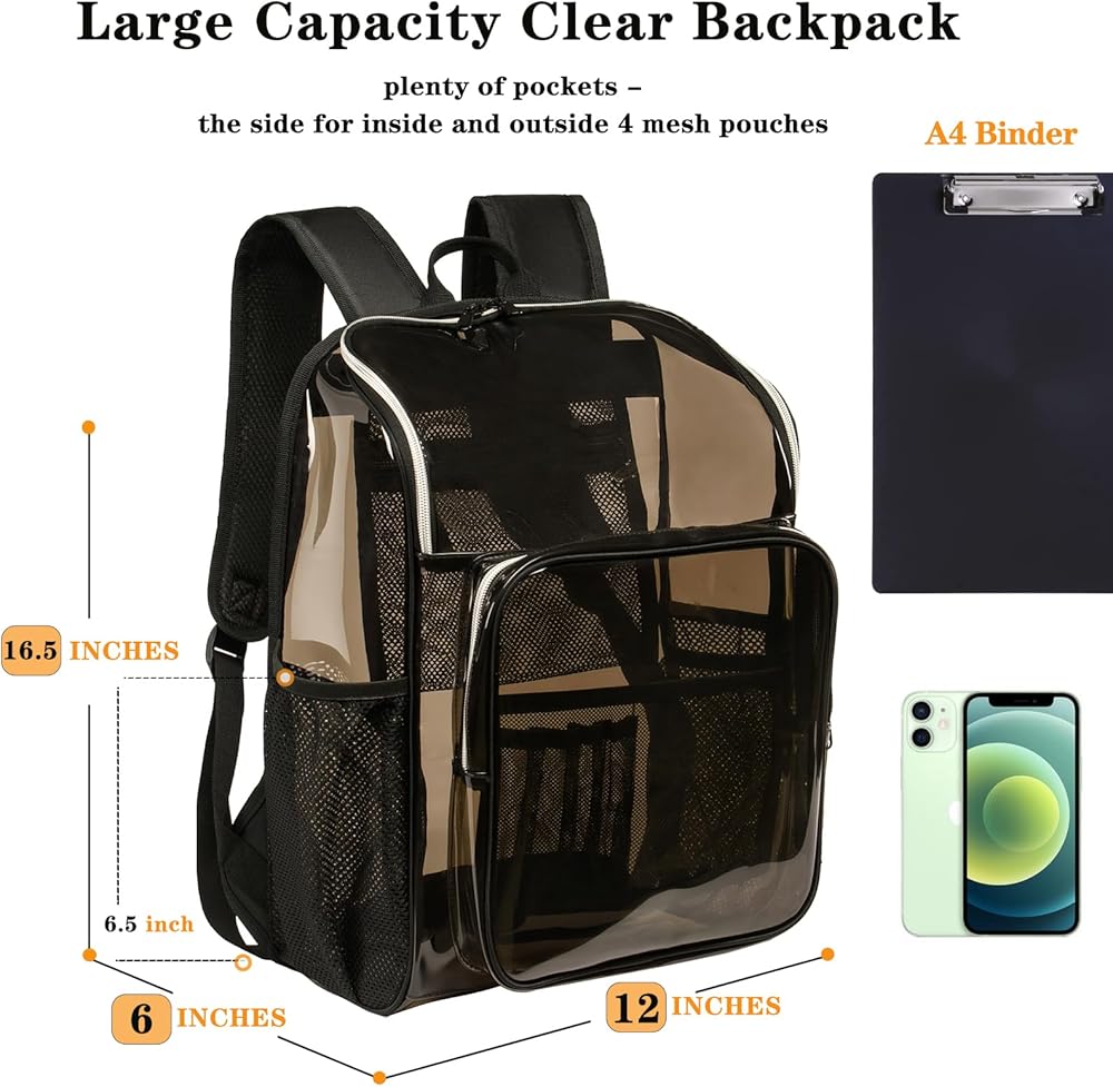 ENOUGH ROOM -- The size of the clear backpack stadium approved (15.5*12*7") that holds binders, belongings like notebooks, 11 inch ipad pro, wallet, sweatshirt or lunch; pencil,umbrella,water bottle,cosmetics and other items. Whether it's for the workplace, a music festivals, or any event that requires a large clear bag, choose our clear heavy duty backpack