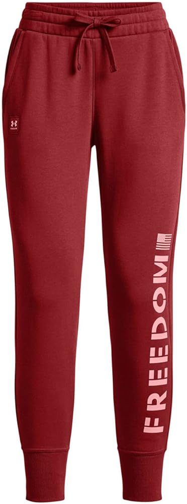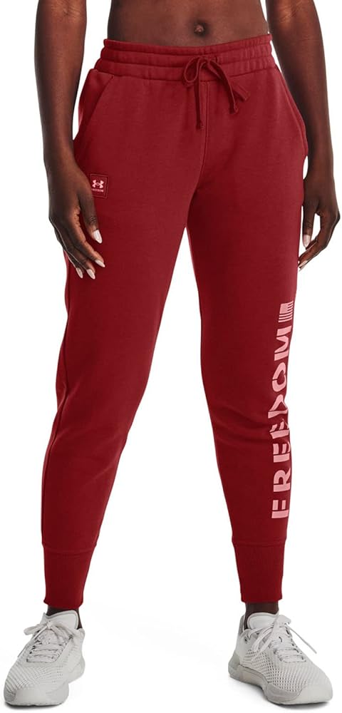 Stay warm and comfortable while you work out with the Under Armour Freedom Rival Fleece Womens Joggers. Constructed with a cotton blend fleece material, these joggers are designed to provide elevated breathability and comfort. The brushed interior helps to retain warmth while remaining lightweight on the skin. An encased elastic waistband holds the joggers in place, with an external drawcord that allows you to adjust for a personalized fit. Functional hand pockets allow for storage of essential items like your phone, wallet and keys — allowing you to go hands-free without the worry of leaving something behind. Plus, their tapered leg design is completed with ribbed cuffs for a secure fit making them perfect for high intensity activities like running or weight lifting. Incredible warmth and mobility make the Under Armour Freedom Rival Fleece Womens Joggers an ideal choice for any woman looking to take her performance to the next level.