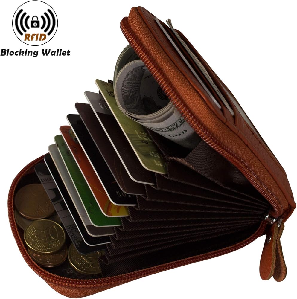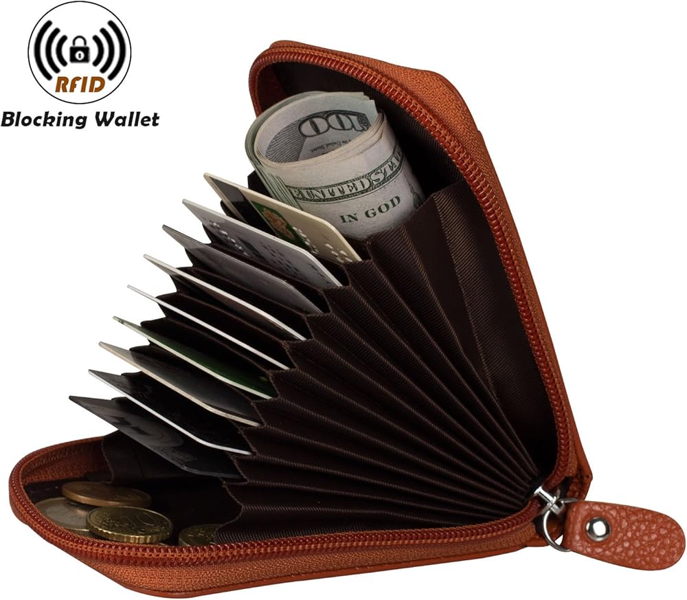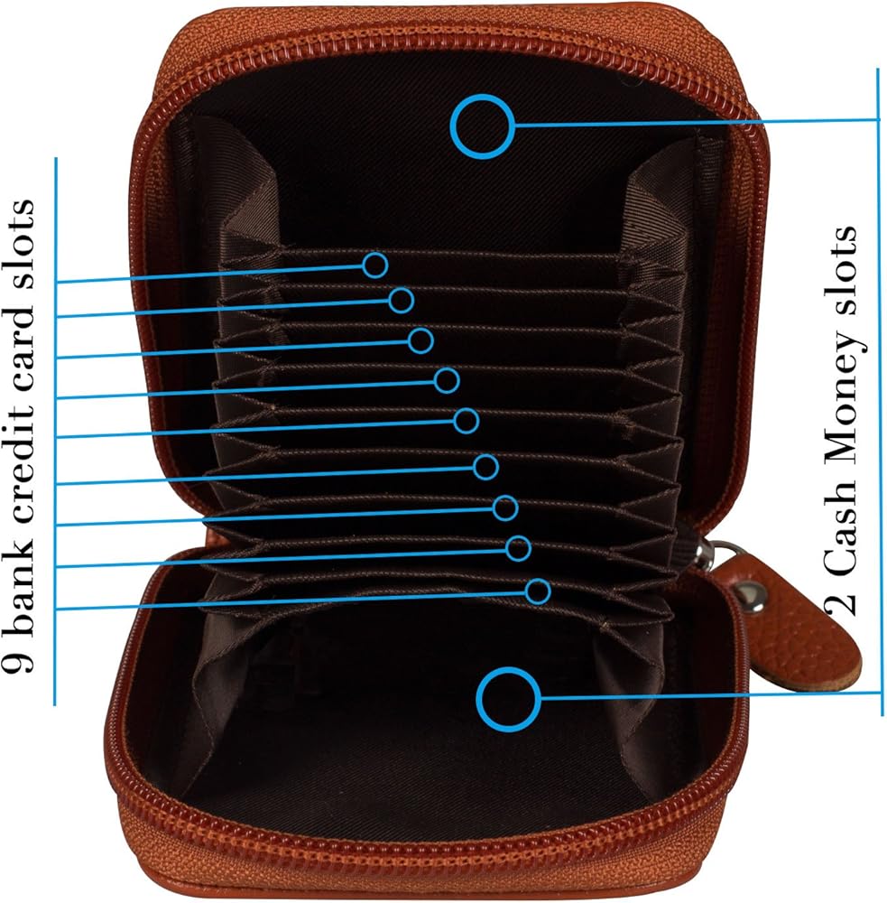 Capacity: 11 RFID blocking card slots insides, 1 clear slot and card slot outside, you can put 1 or 2 cards into each card slot, also you can put notes, receipts or some folded cash into beside compartment. Comfortable to use for carrying your most frequently used cards and a few bills.
