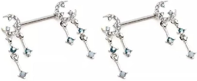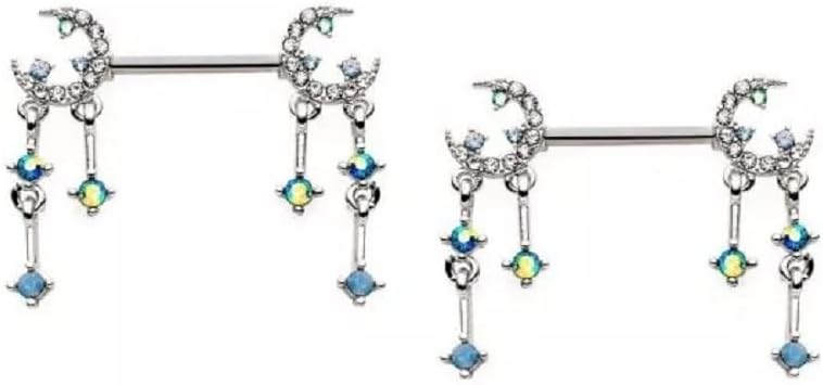 - STYLE: Gemmed Crescent Moon and Star with Dangling Charms Nipple Barbells