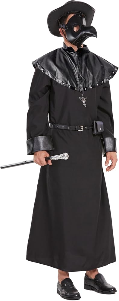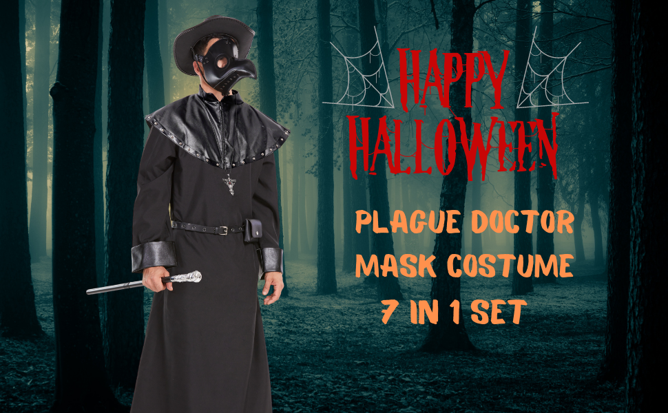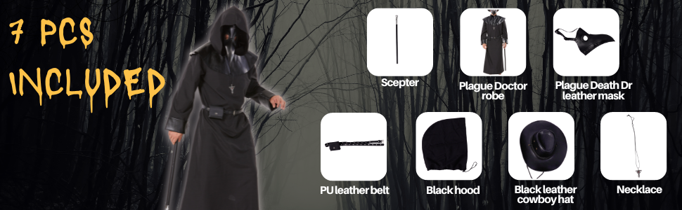 【Package Details】 This Doctor Plague costume 7pcs set consists of 1 black Plague Doctor robe, 1 black leather cowboy hat, 1 black hood, 1 Plague Death Dr leather mask, 1 necklace,1 Scepter and 1 PU leather belt with a purse accessory. This Halloween style dress can meet all your needs for your Halloween.