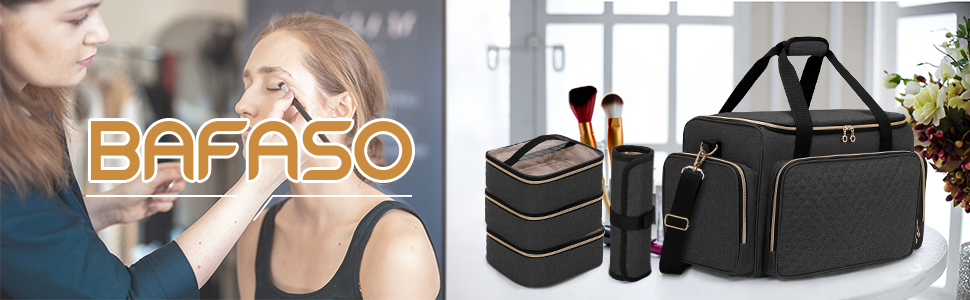 PACKAGE INCLUDES - 1 makeup bag (16.5” x 9.5” x 11.5”) with detachable dolly, 3 removable cases (8.75” x 7.5” x 3.25”) and 1 roll-up makeup brush bag (open size: 19" x 9").