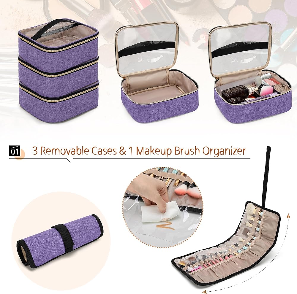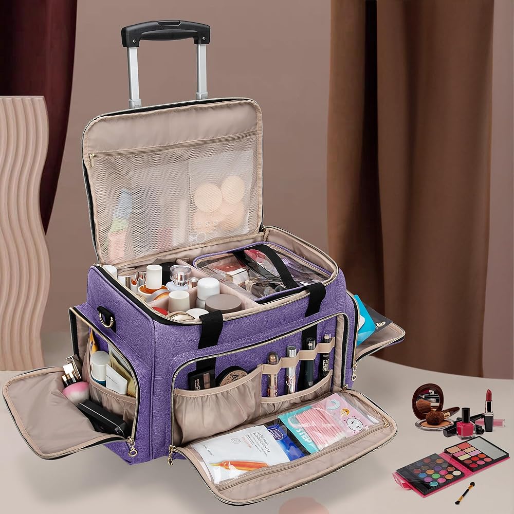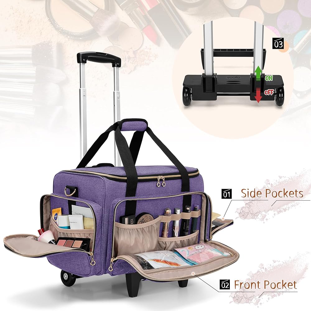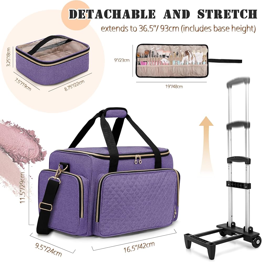 BAFASO Rolling Makeup Case with 3 Removable Cases and 1 Makeup Brush Holder Bag, Multifunctional Makeup Bag with Detachable Dolly (Patented Design), Purple