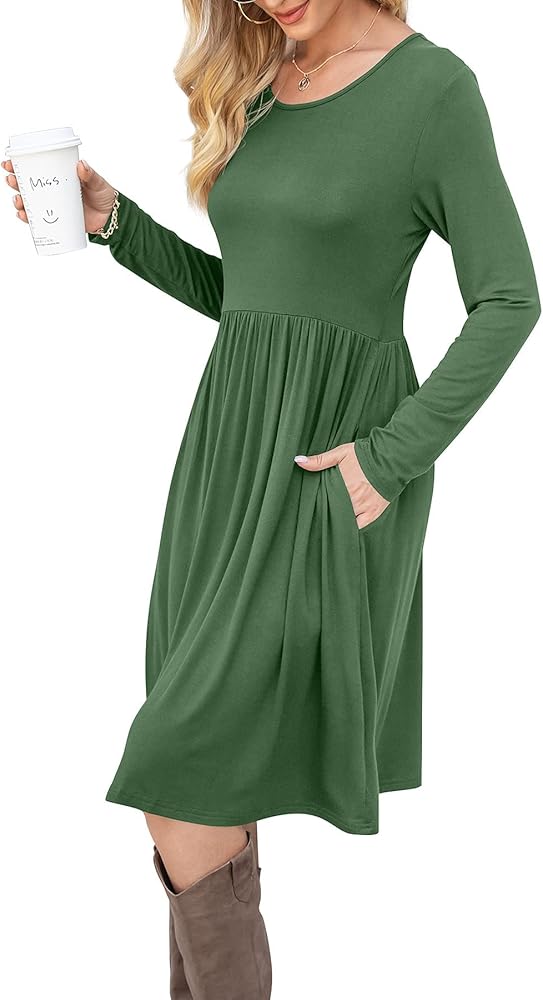[Features] : Round neck, Long sleeve, elastic waist and pockets. This dress is lightweight and casual, There is an elastic band at the waist seam.