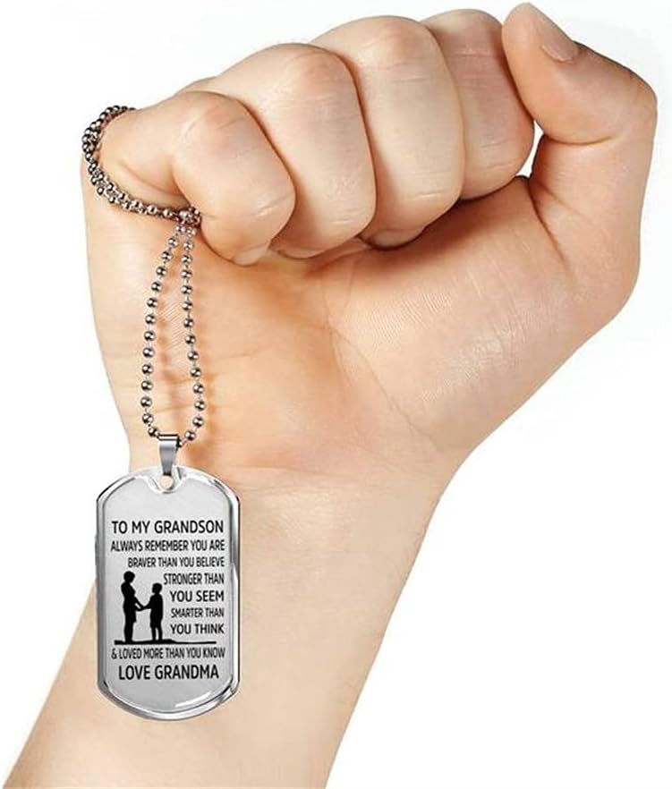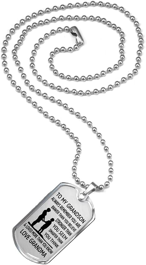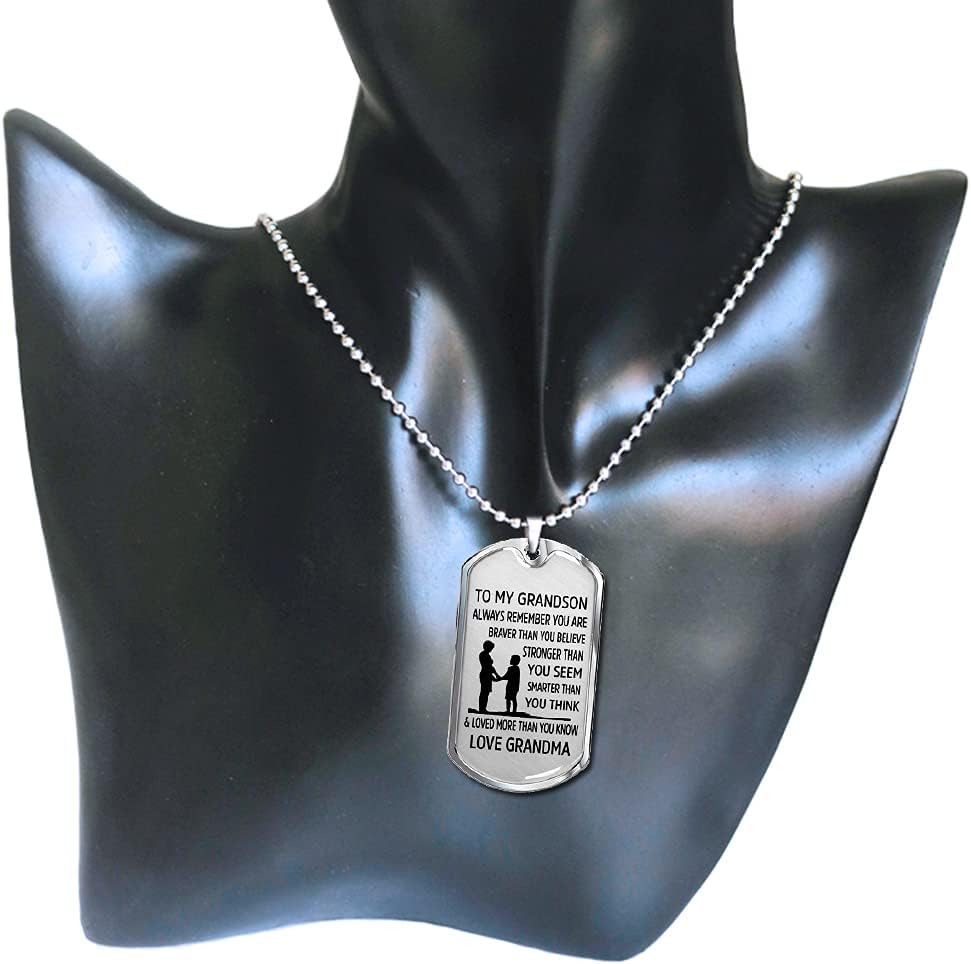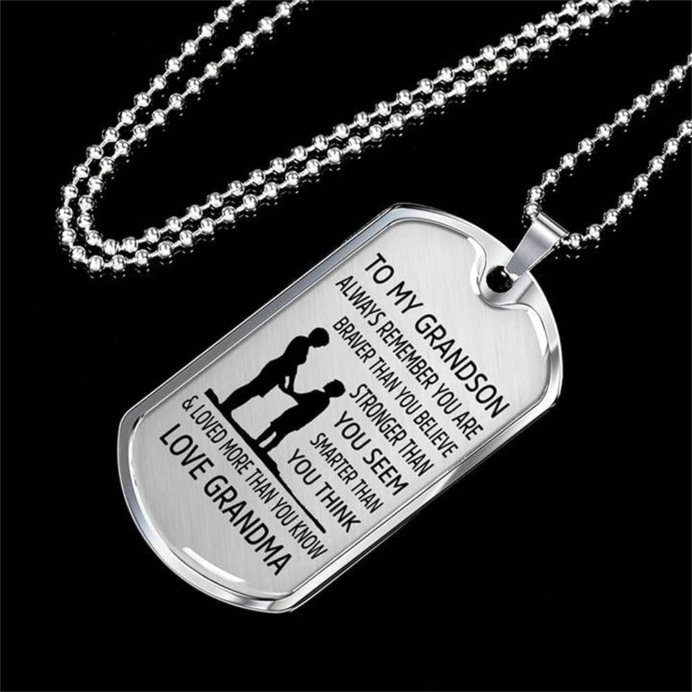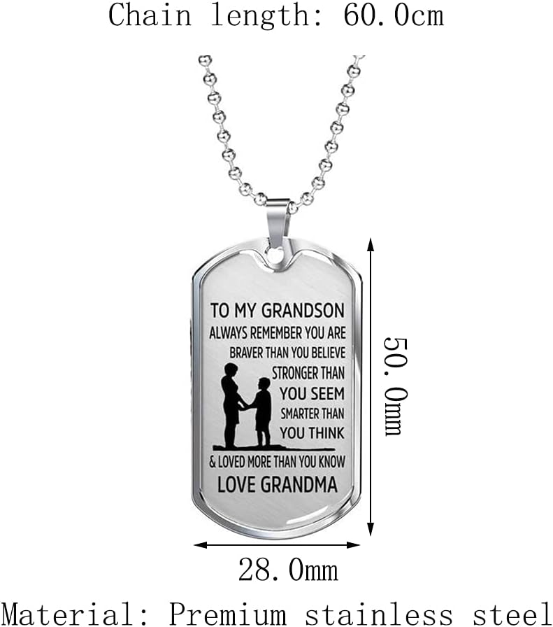 【Inspirational Necklaces For Grandson】Necklace Reads: To My Grandson, Always Remember You are Braver than You Believe, Stronger than You Seem, Smarter than You Think, & Loved More than You Know. Love, Grandpa/Papa. Love, Grandma/Nana