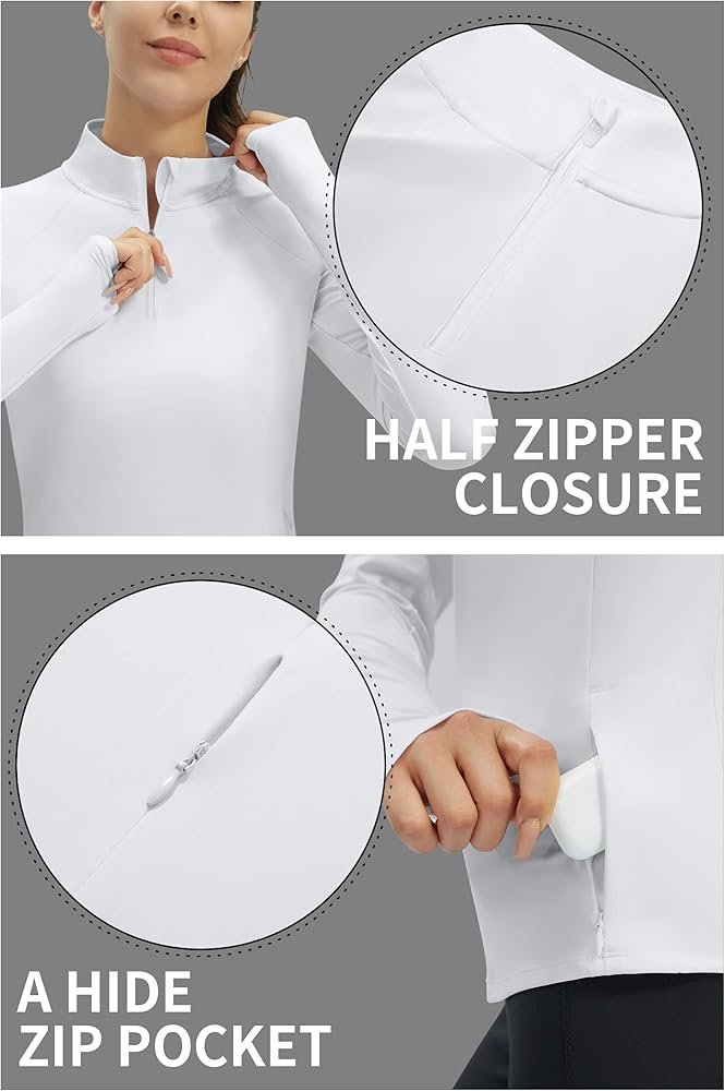 Thumb Holes & Hidden Zipper Pocket ► With thumb holes, hiking shirts women provide extra hand coverage and help sleeves stay in place, you can stretch your arms at will. A hidden zipper pocket, which is at left side of running shirts women, can easily store your keys, cards, earphones. Hidden zipper will not affect the beauty of upf 50 long sleeve women shirts.
