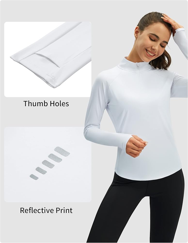 Half Zipper & Reflective Print ► Used with half zipper closure, athletic shirts women are easy to wear or take off. Heighten collar will effectively protect your neck from UV rays. Reflective print on the back of these sun shirts for women long sleeve uv protection gives the whole outfit extra highlights.