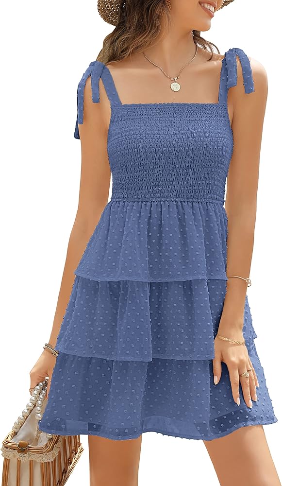 UNIQUE DESIGN: The blue mini dress boasts a super comfortable square neckline. The smocked bodice can be stretched to accommodate the bust. With the unique adjustable tie shoulder straps, you can tie sweet bow-knots to easily adjust the length. Feel free to choose the cute floral mini dress or the elegant swiss dot dress in your need.