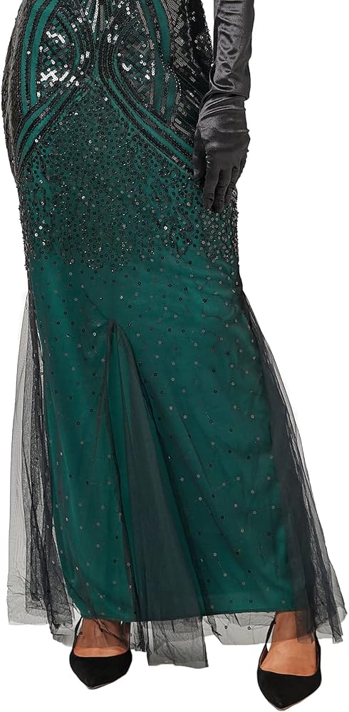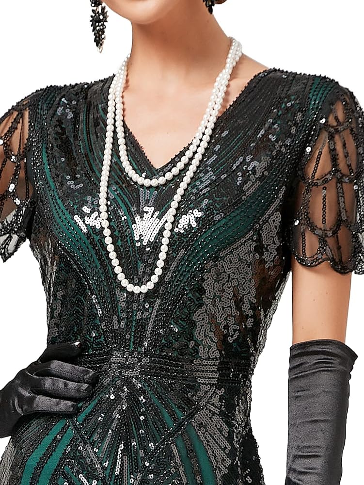 Package:1 x Sequin Dress, 1 x Cigarette Holder, 1 x Long Satin Glove, 1 x Feather Headband, 1 x Pearl Necklace, 1 x Earring, 1 x Pearl Bracelet