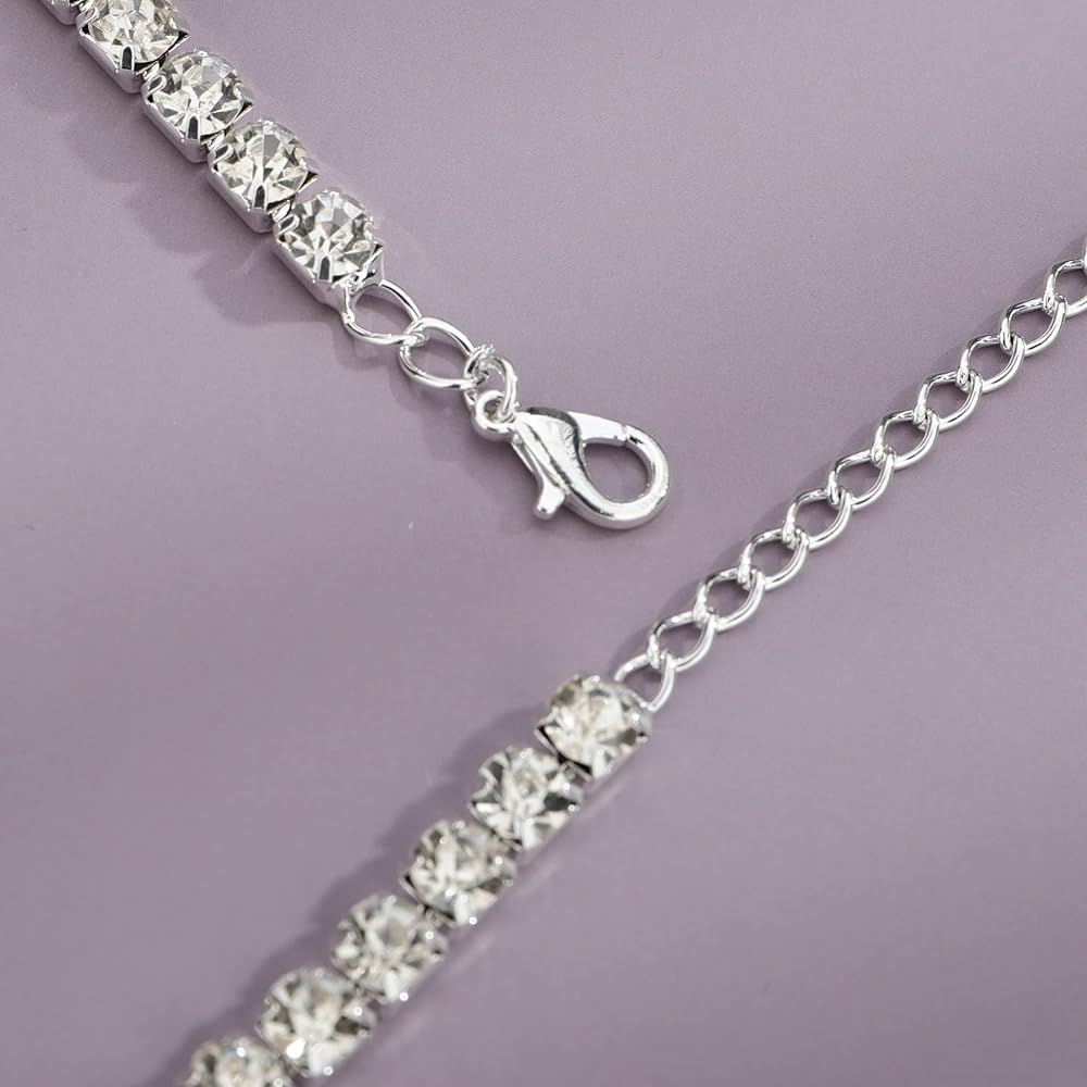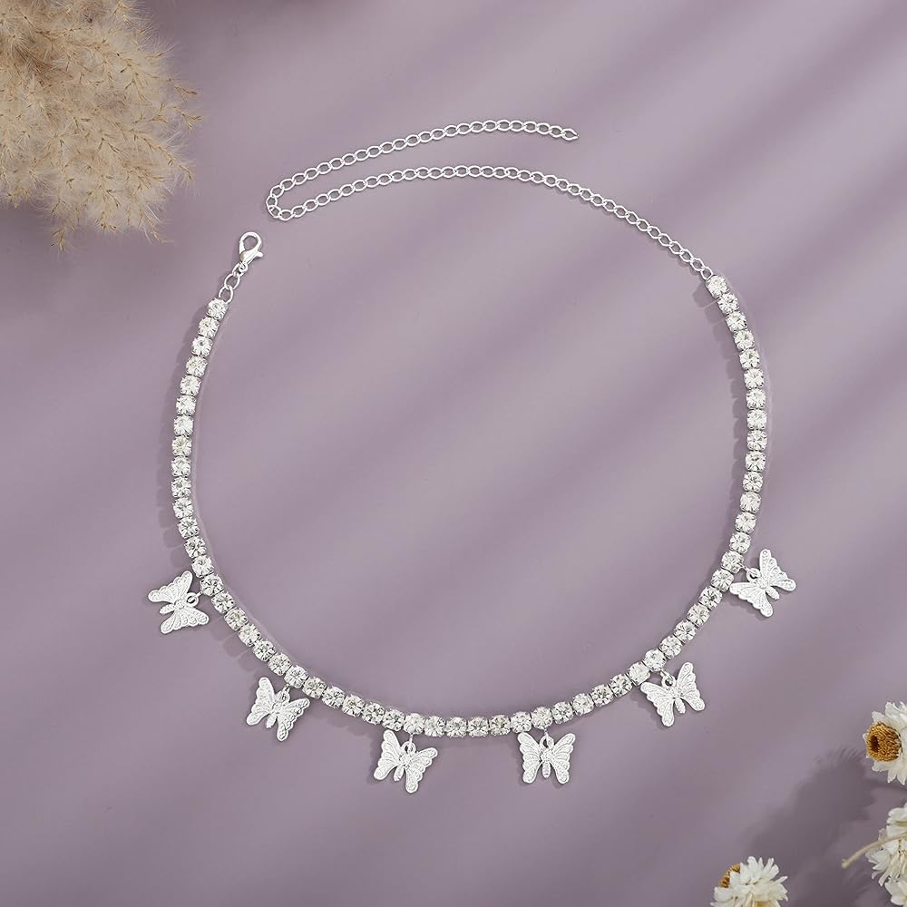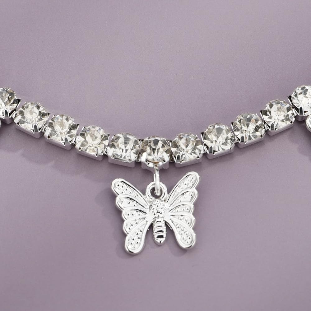 YERTTER Dainty Full Silver Butterfly Pendant Rhinestone Tennis Chain Rhinestone Collar Statement Clavicle Choker Necklace Adjustable for Wedding Party Music Bar Women (Silver)
