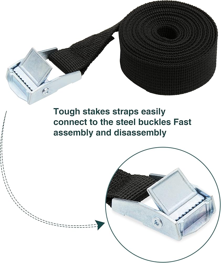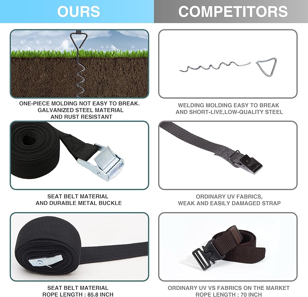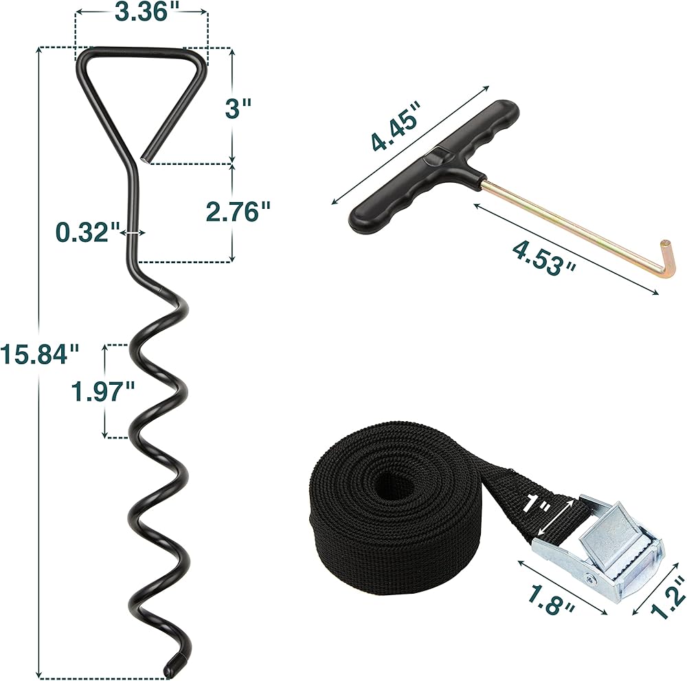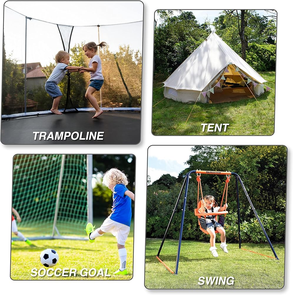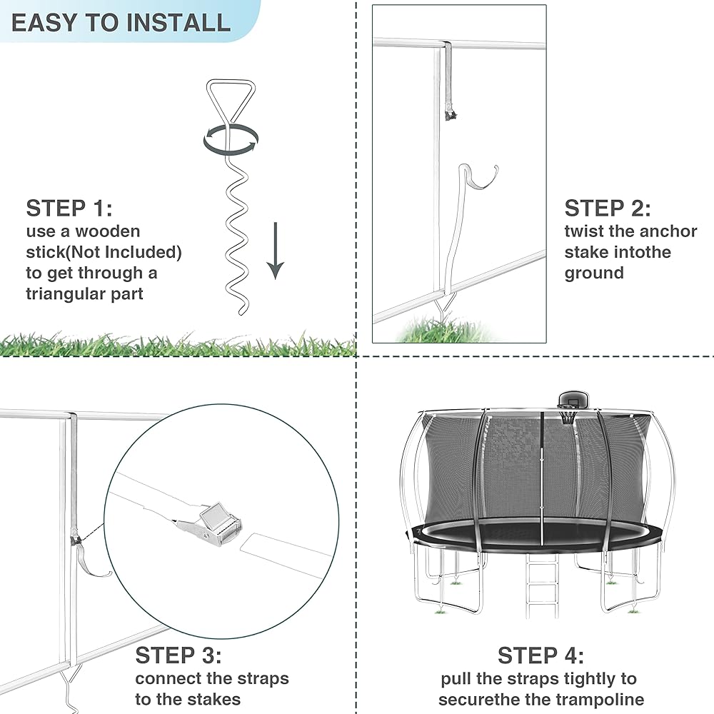Easy to Install and Dismantle: The steel cork-screw anchors are designed to twist deep into the ground, providing superior stability for your trampoline. Additionally, the strong belt straps can be easily connected to the steel buckles, making assembly and disassembly a breeze.