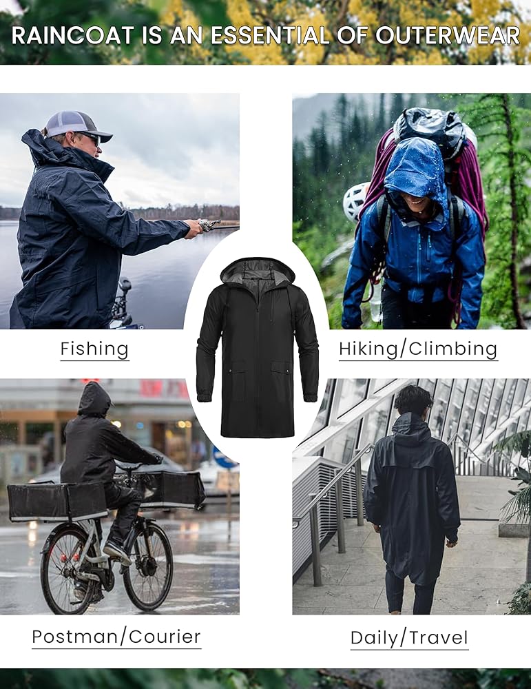 Occassions: Fashion hooded rain coats fitting for working or outdoor activity including hiking, camping, traveling, fishing, hunting, boating cycling, golf, Climbing, Shooting, Riding, Adventure or simply jogging, water rides, site seeing, dog walkers, etc.