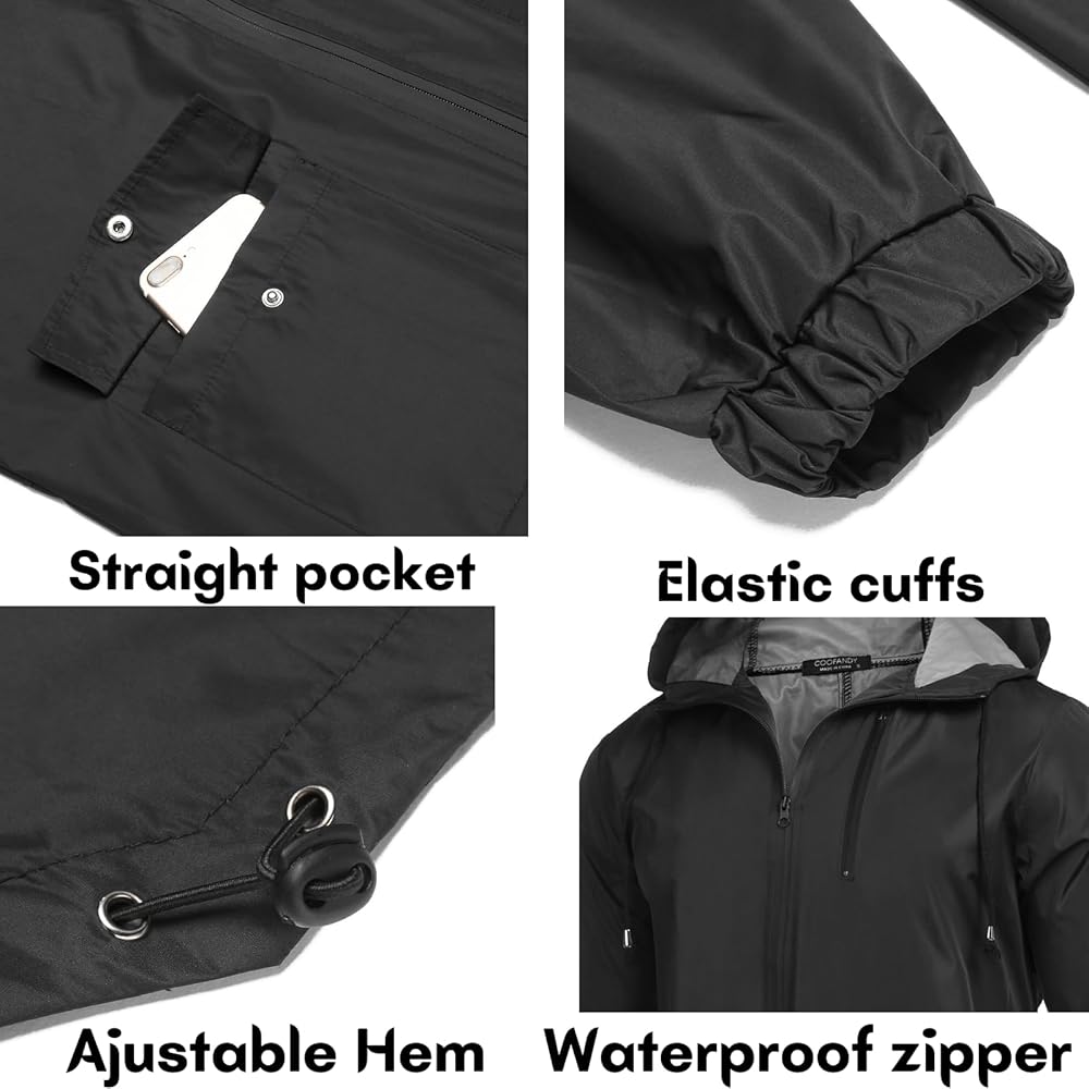 Waterproof Performance: Hooded rain jacket with waterproof coating design to offer maximal rain protection and keep you dry and clean in wet weather, this lightweight windbreaker jacket can be matched all outwear, casual or outdoor style as you like in all season. Suitable for men and women of all ages.