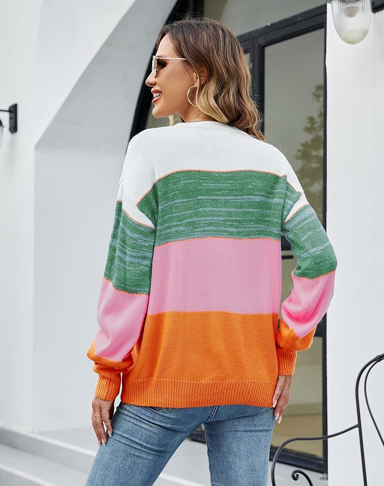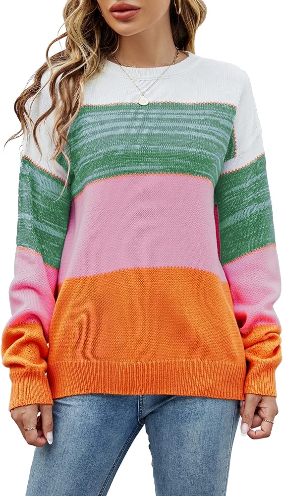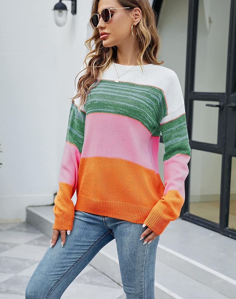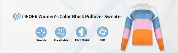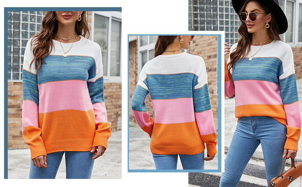 Features: Vivid and highlighting color block, Crew neck, Long sleeve, Knitted sweater, Pullover sweater, Casual sweater for fall and winter, Basic Casual fit