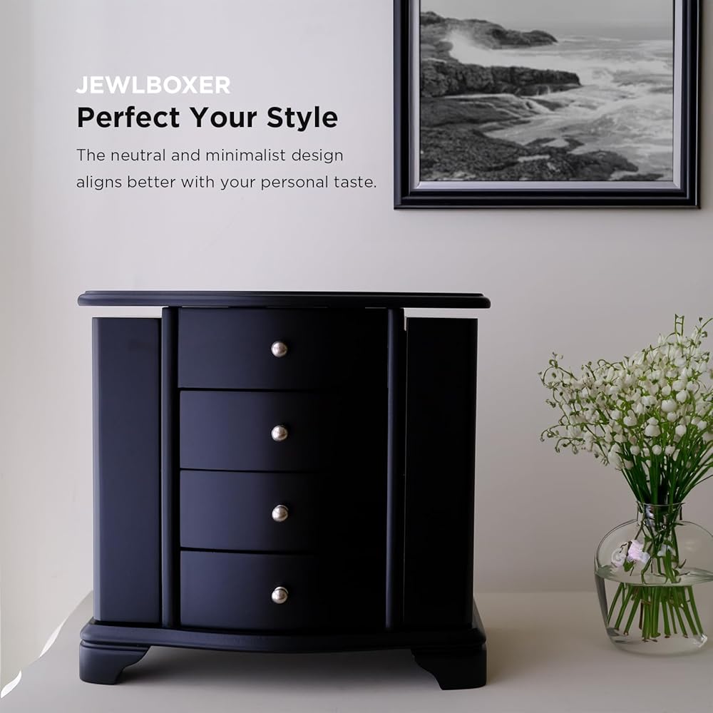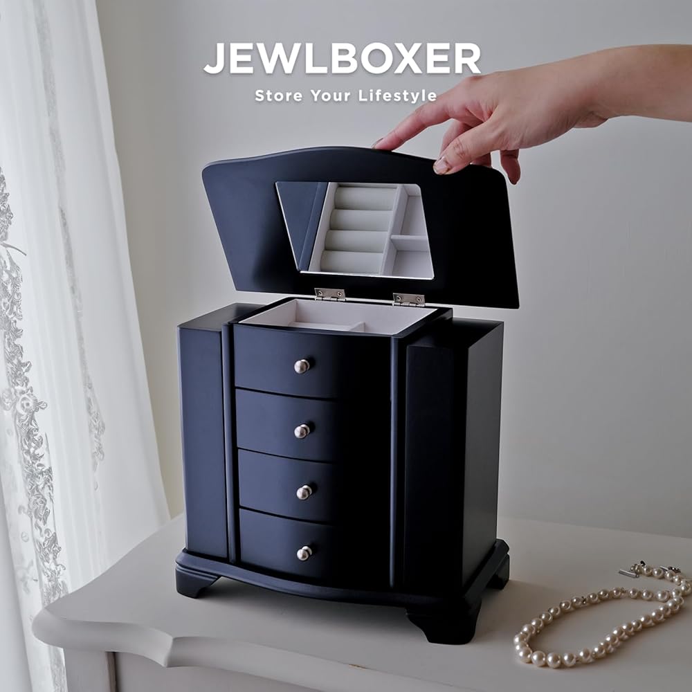 All-in-one Jewelry Box Our wooden jewelry box is made of quality materials with a java black finish and has perfectly sized compartments and drawers that are sure to fit your storage needs. When you open the top of the box, you'll see 4 small compartments and one of it with interior velvet ring rolll. The interior is hand lined with a plush ivory sueded fabric. There are 3 drawers below the top compartment . The sides feature 2 necklace doors that each have 3 hooks on the inside. The jewelry box measures 9 3/4" x 5 1/2" x 9 1/4" and is the best solution whether you're looking to store your necklaces, earrings, or bracelets. We also added an oval mirror to the inside of the top lid to help you look your best every day. This jewelry box is the perfect gift for your mom, sister, best friend or anyone else who appreciates quality. Whether it's for a wedding or birthday gift, this is your best choice! Get a Wooden Jewelry Box today for your loved one!