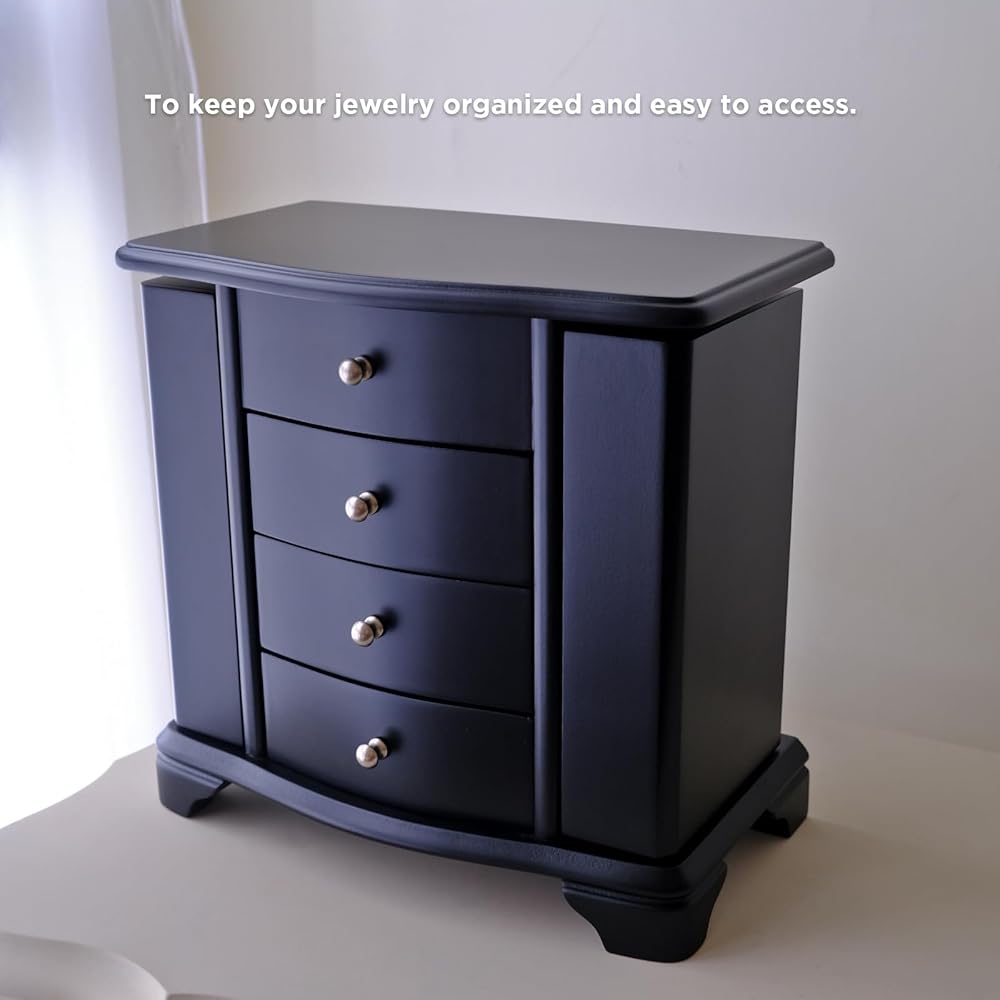 ELEGANT WOODEN JEWELRY BOX: This morden classic wooden jewelry organizer box is made of wood and finished with JAVA BLACK, Item size 9 3/4" x 5 1/2" x 9 1/4" (L*W*H)