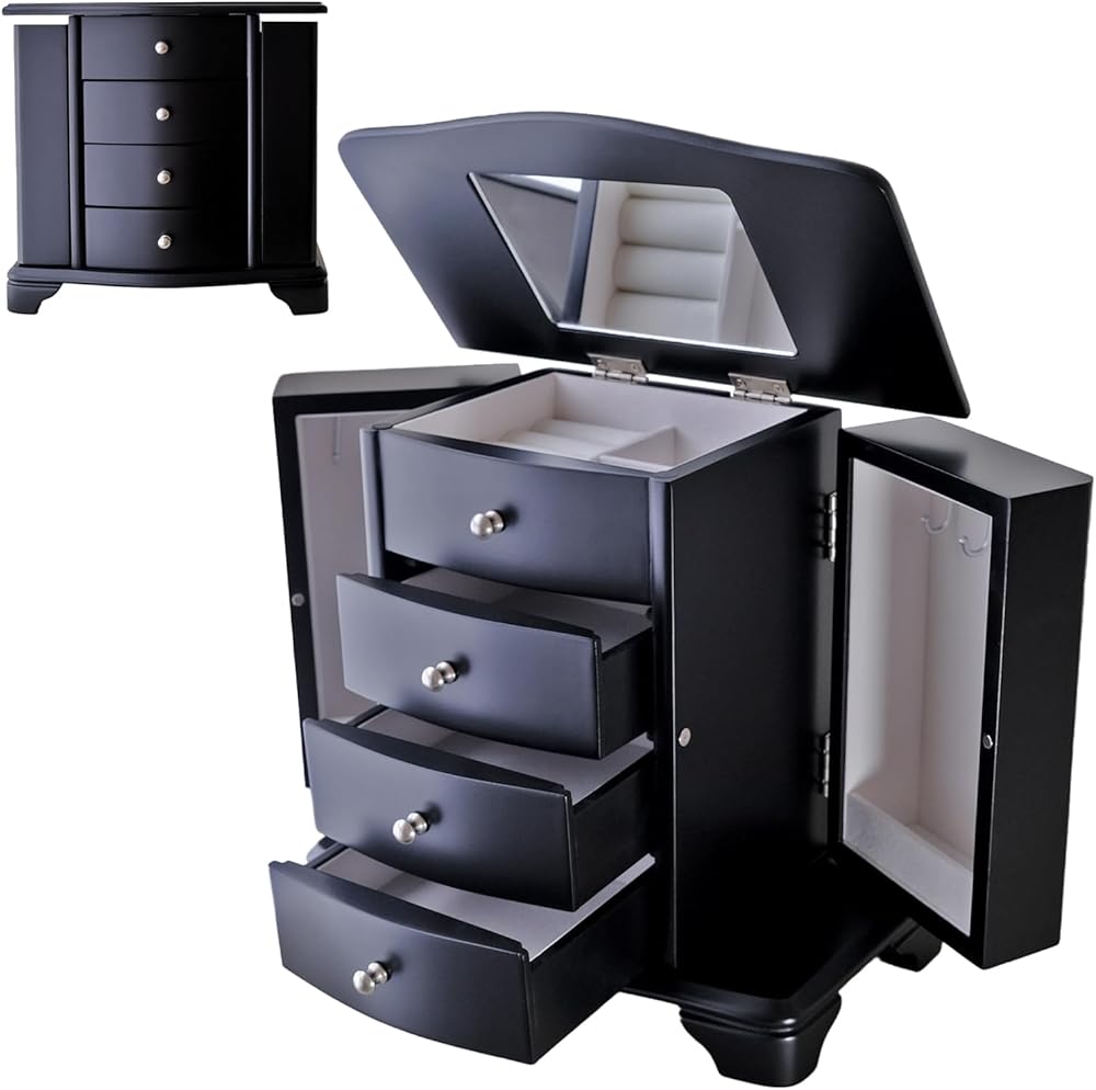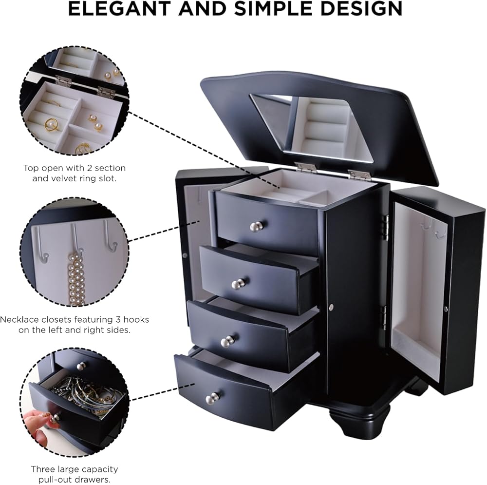 STORE YOUR LIFESTYLE: The all-in-one jewelry box provides functional space and keeps all of your jewelry in mint condition. Flip the lid, and there's a large mirror on the back of it. Below the top compartment there are 3 drawers which has velvet linen and big space to let you keep jewelry easily. The sides feature 2 necklace doors each with 3 hooks on the inside.