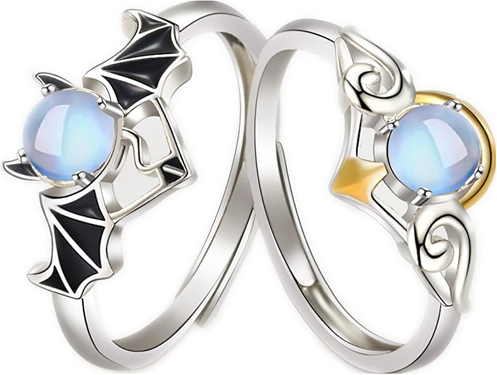【Design】Demon and angel promise rings for couples, gift to your loved person, best to signify your fidelity and commitment. Unique matching rings, boast with translucent moonstones, shines with blue hue under dim light.