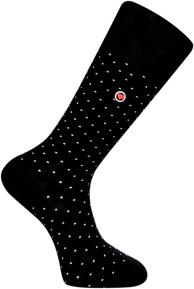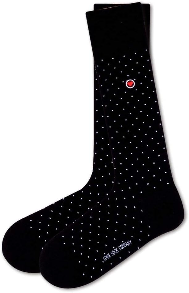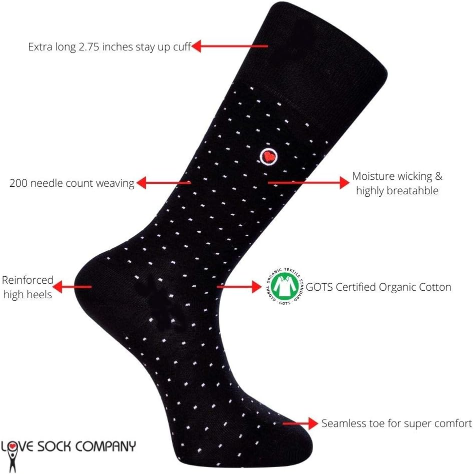 Softest socks on the planet. Pair of 100% organic cotton dress socks, designed in USA, made in Europe. LSC Socks are the ultimate luxurious socks knitted with 200 needle machines and made from the softest organic cotton. Update your top drawer with a pair of Organic Love Sock Co. socks. This super-soft luxurious pair adorned with mini polka dots design is a perfect complement for suits, casual trousers, khakis and jeans. Organic cotton's natural antibacterial and hypoallergenic properties keep your feet hygienic and healthy. Knitted with 200 needle machines and hand-linked toes, make these socks one of the highest quality organic socks in the market today. PRODUCT DETAILS 98% Organic Cotton, 2% Elastane Hand-linked toes Reinforced heel and toe One size fits most, US Men size 7-12 Men socks Your 100% satisfaction is guaranteed or your money back!