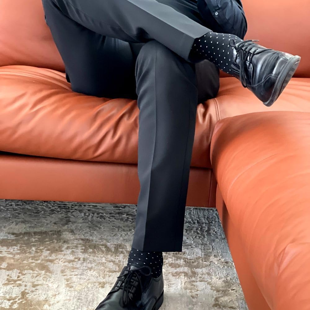 Men's Organic cotton mid calf black dress socks with white polka dot design.
