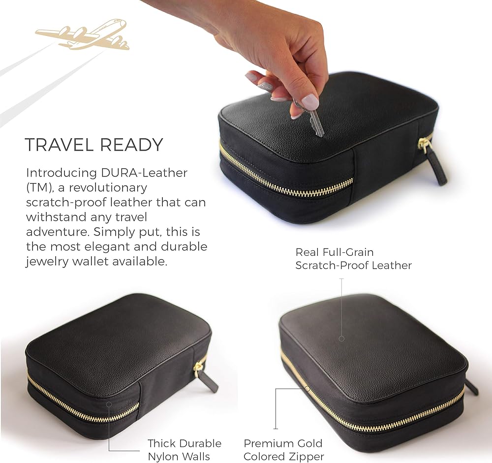 SCRATCH-PROOF LEATHER - We have incorporated DURA-leather (TM) technology into the top and bottom leather components. This travel jewelry cases scratch-proof leather ensures you're always looking great even if you experience rough traveling conditions.