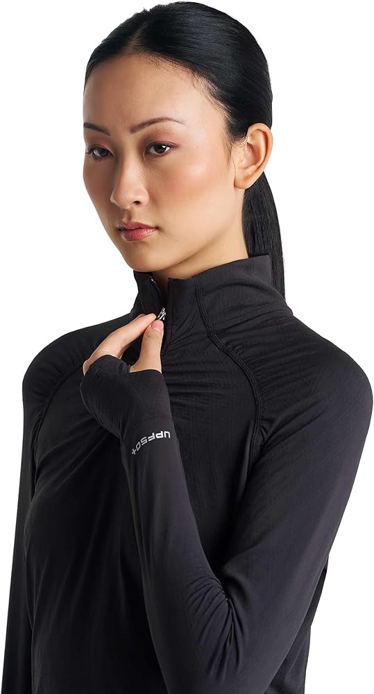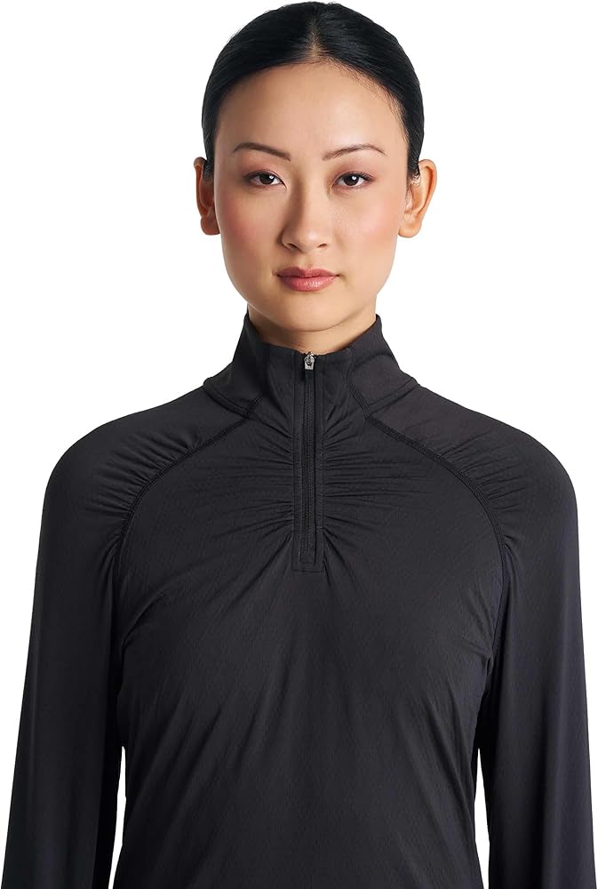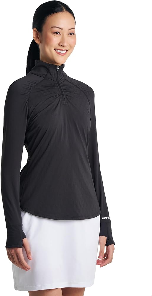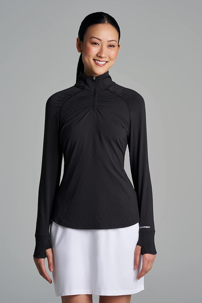 FEATURES: Slightly fitted, stand collar with quarter-zip, raglan full-length sleeves with thumbholes and curved hem for added sun protection; Slightly curved hem, ruching detail on raglan seams and beautiful jacquard texture for surface interest; 26 1/2 inch body length (size medium); Machine wash, tumble dry; Imported
