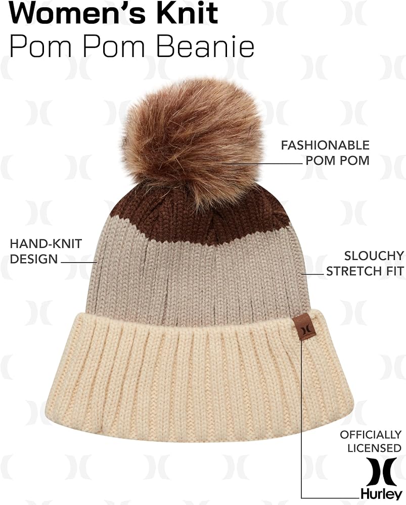 FASHIONABLE: Wear the beanie slouched or pulled down snug over your ears for the perfect Hurley look; You'll be earning style points left and right with our iconic beanie; The cute pom pom and beautiful hand-knit pattern will add a unique twist to your everyday look while the soft and comfortable fabric will keep you warm and ready to take on the day even on the coldest winter days