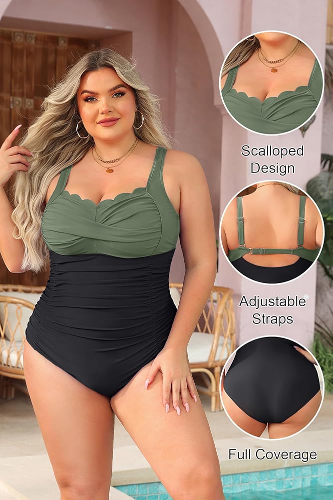 Plus Size Retro Swimsuits: The twist front with a scalloped collar perfectly showcases your neck curves.