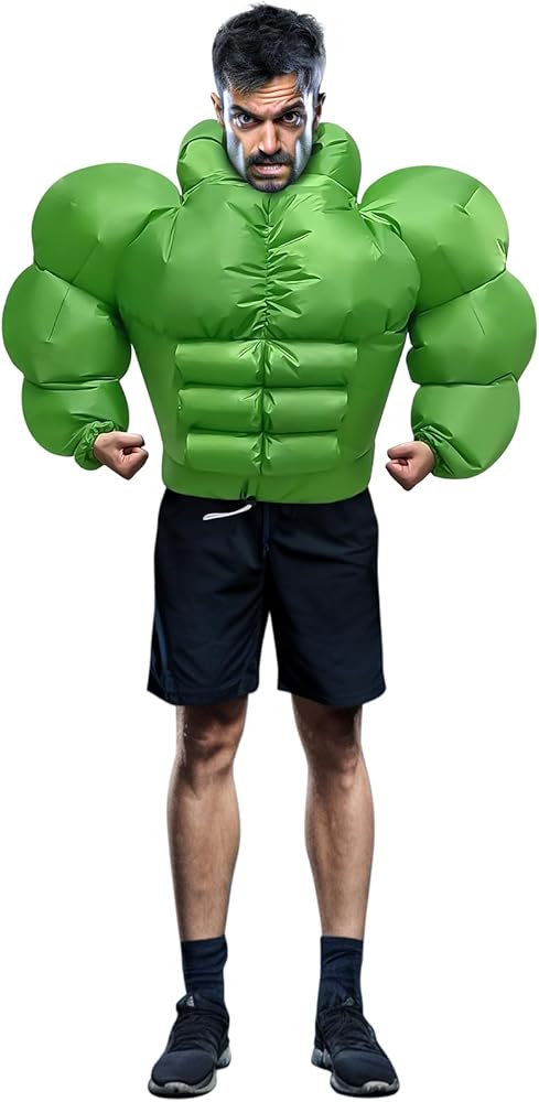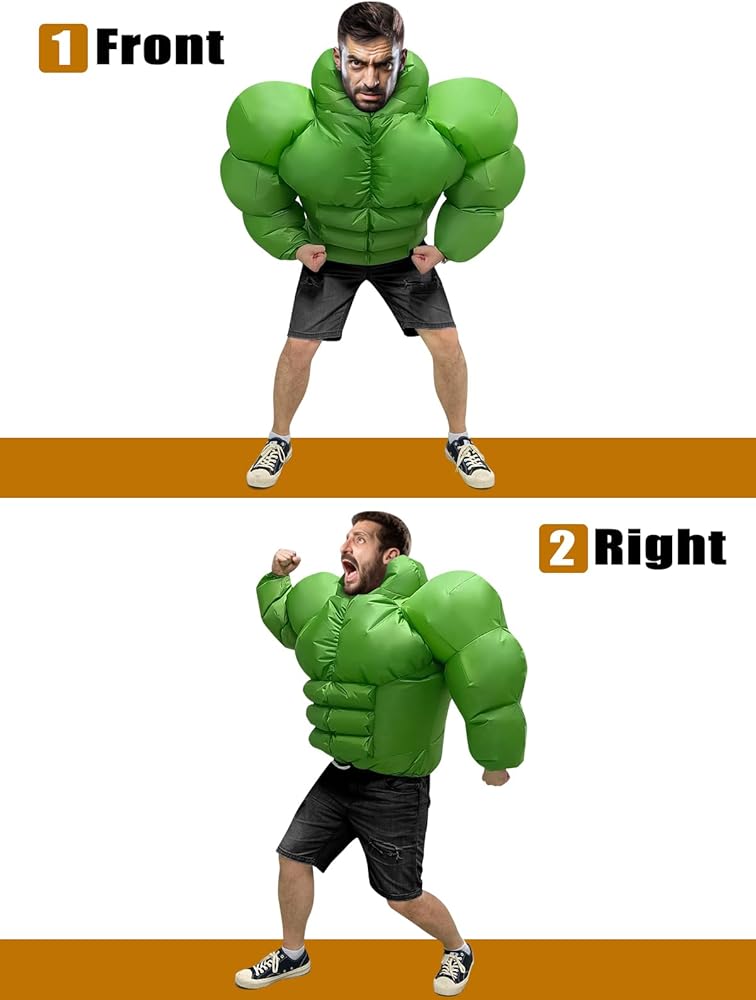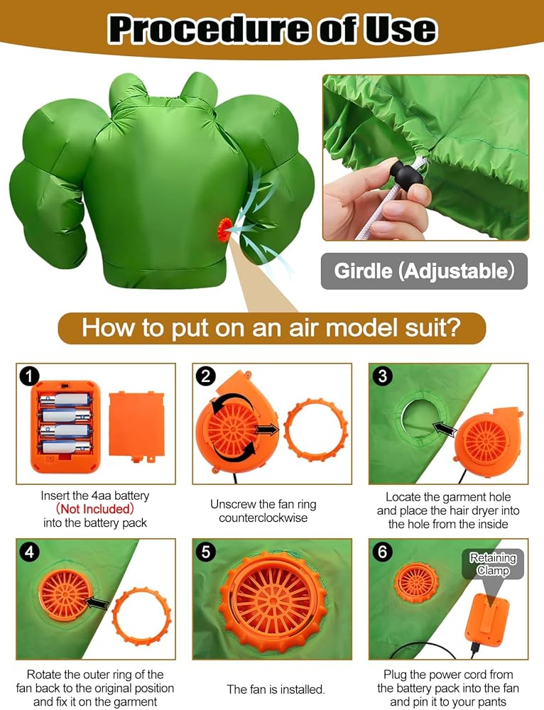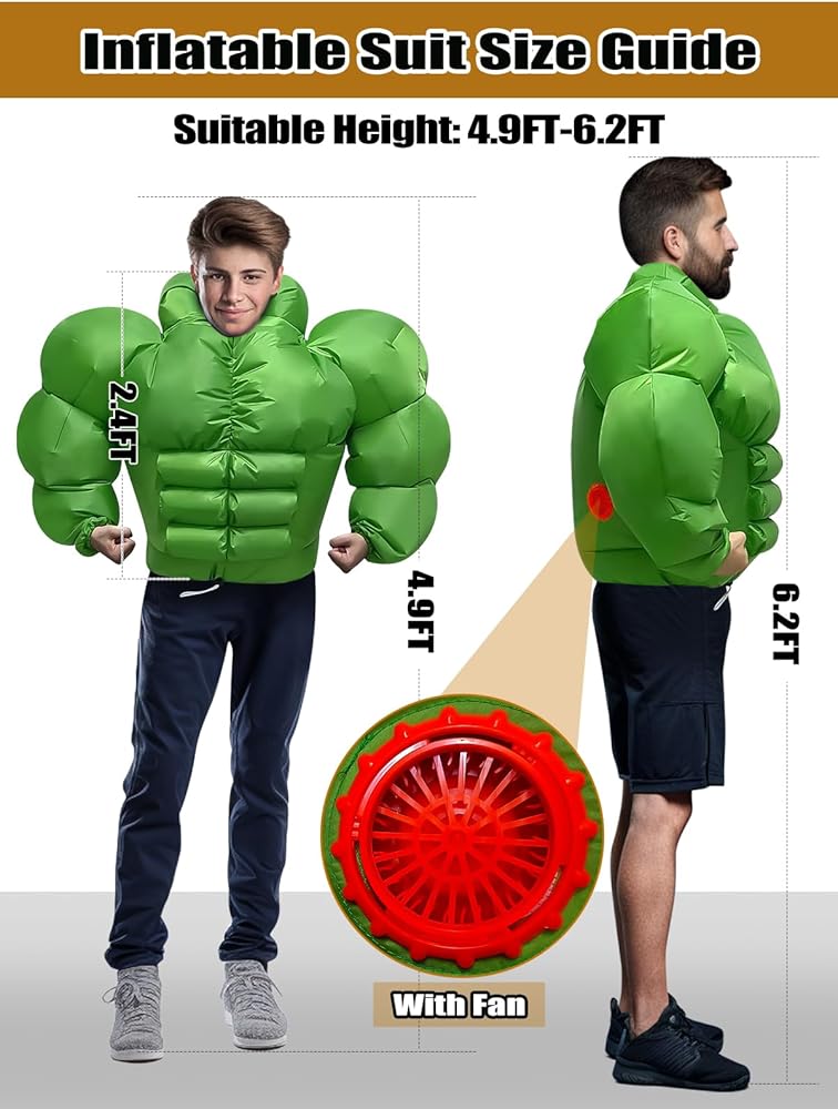 Features - Wearing this inflatable muscle costume to bring joy to people around you, with quality fabrics can be worn multiple times for different occasions. - Funny inflatable costume can inflate for a long time, you can wear it to run, squat, sit or other positions, will not affect the inflatable use. - Wear it, running and playing will not be hot, because the fan circulates air inside the suit, which can keep cool while entertaining. Specification Style: Halloween Inflatable Costume Material: Polyester Color: Green Inflatable Suit Size Guide: 4.9FT-6.2FT Warm Tips - Please pin the power case to your belt, don't ever put it in your pocket, or the device will overheat. - Before starting to inflate, make sure the outer fan ring is completely screwed on the garment to prevent the ring from loosening. - Before starting to inflate, please make sure that the cord is tight, otherwise it will not be able to achieve a full filling effect.