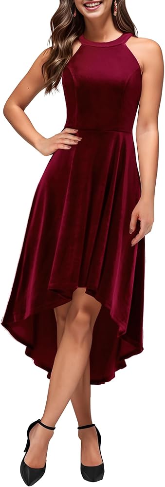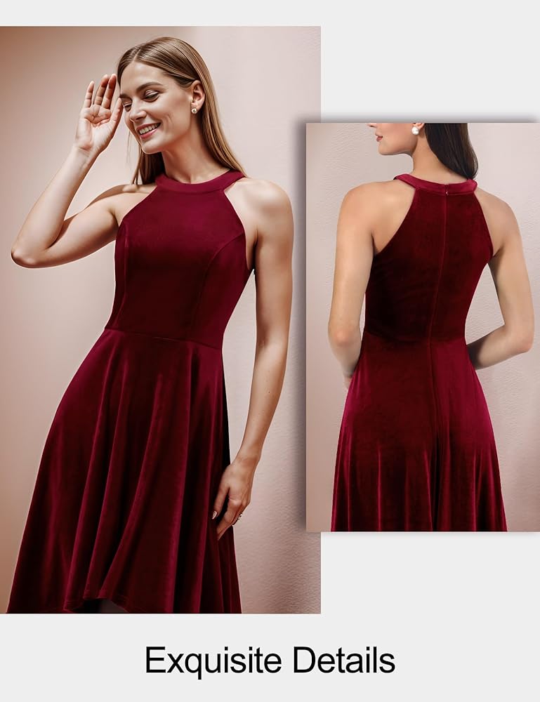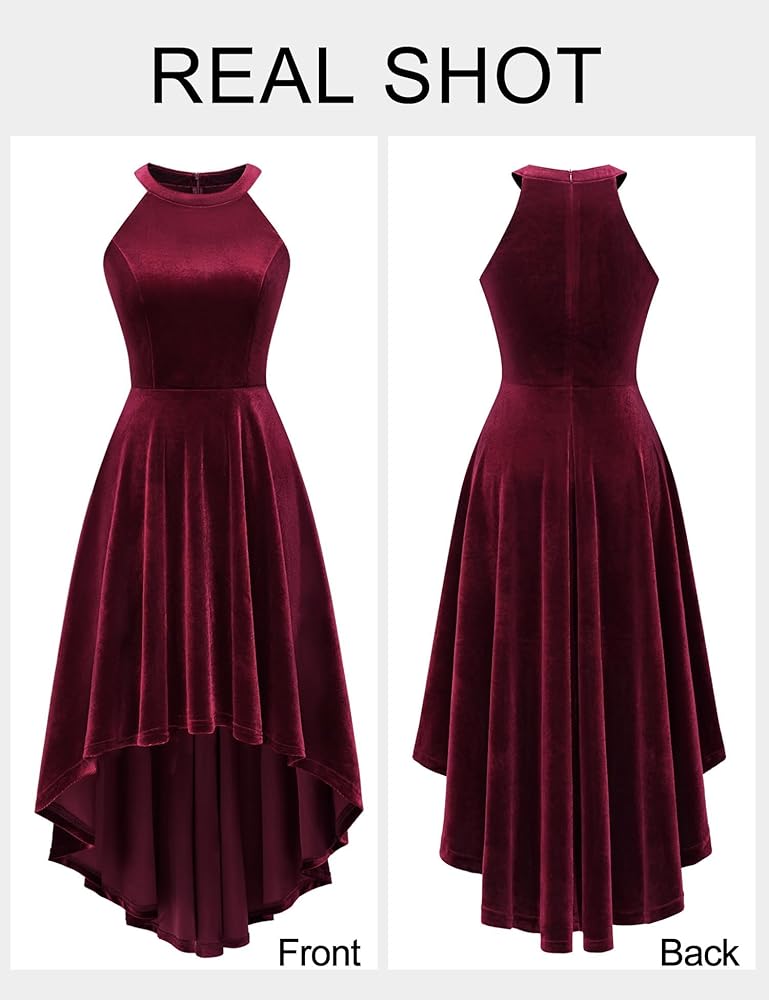 Easy Matching: classic long velvet dress featuring high-low hemline, halter-neck, solid color is easy to pair with high heels, boots, and overcoat for your winter stunning look