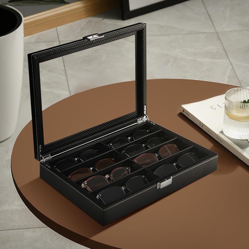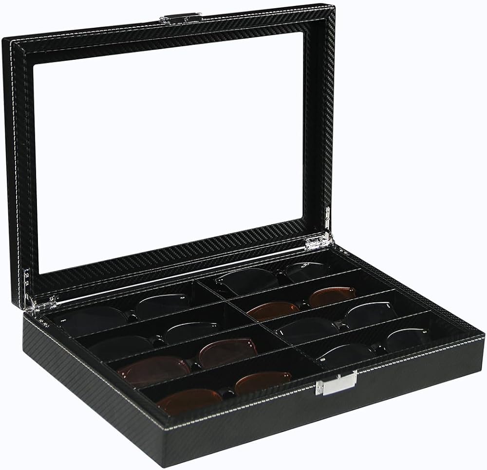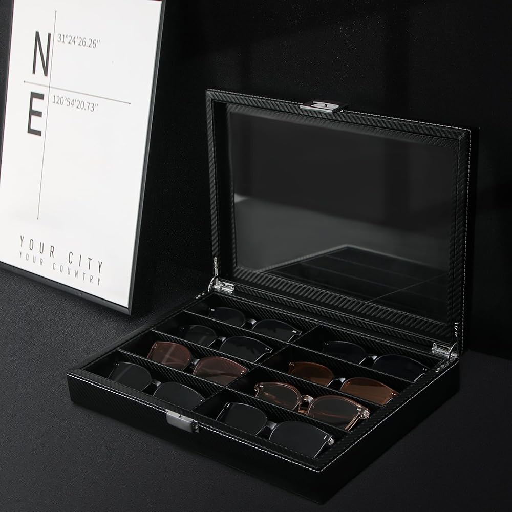 ByKen Sunglasses Organizer for Women Men, Eyeglasses Display Case,Carbon Fiber Sunglasses Collection Box, Sunglass Glasses Storage Holder Box,8 Slots Black