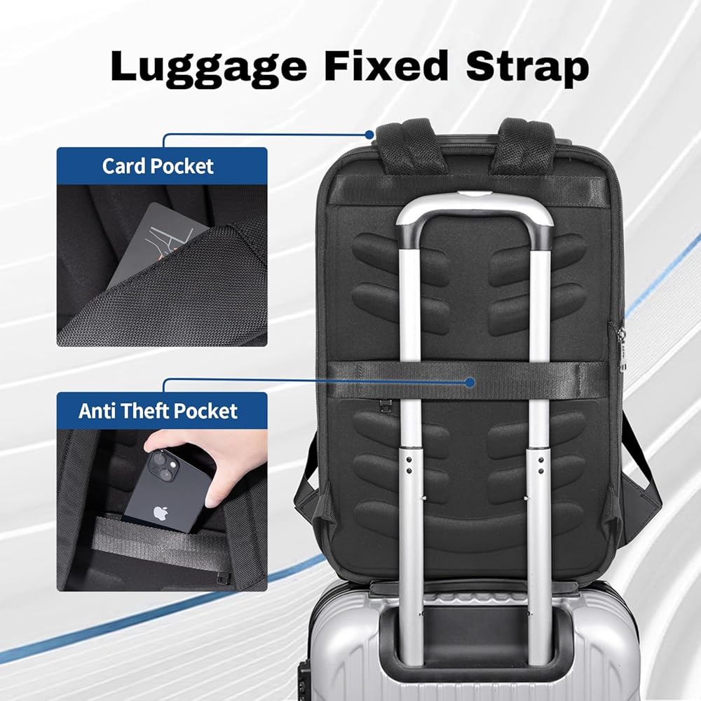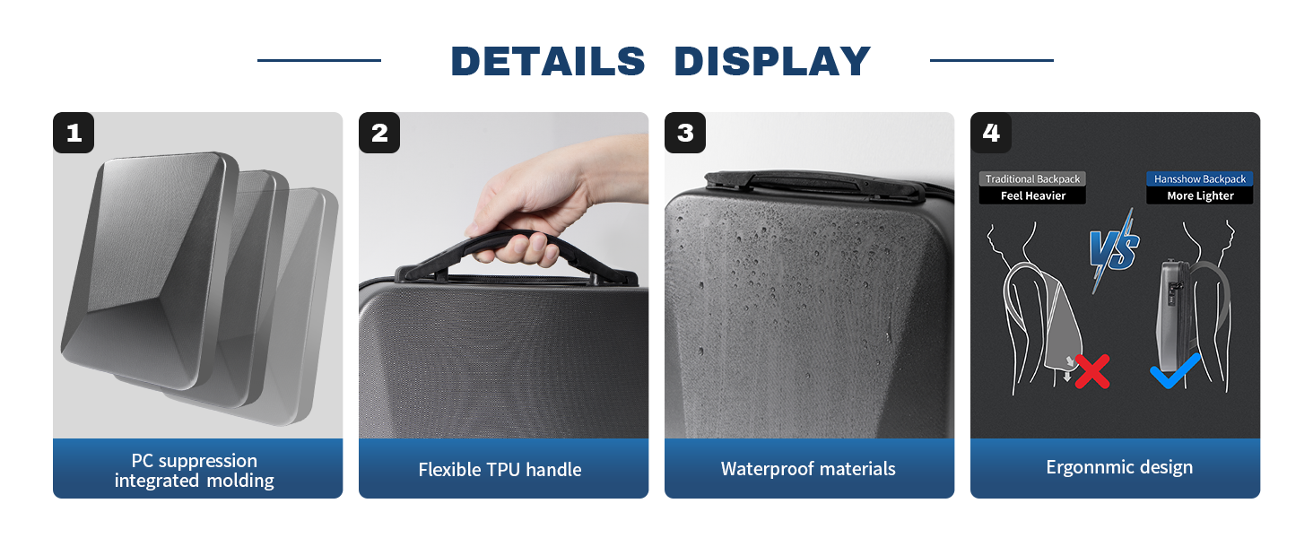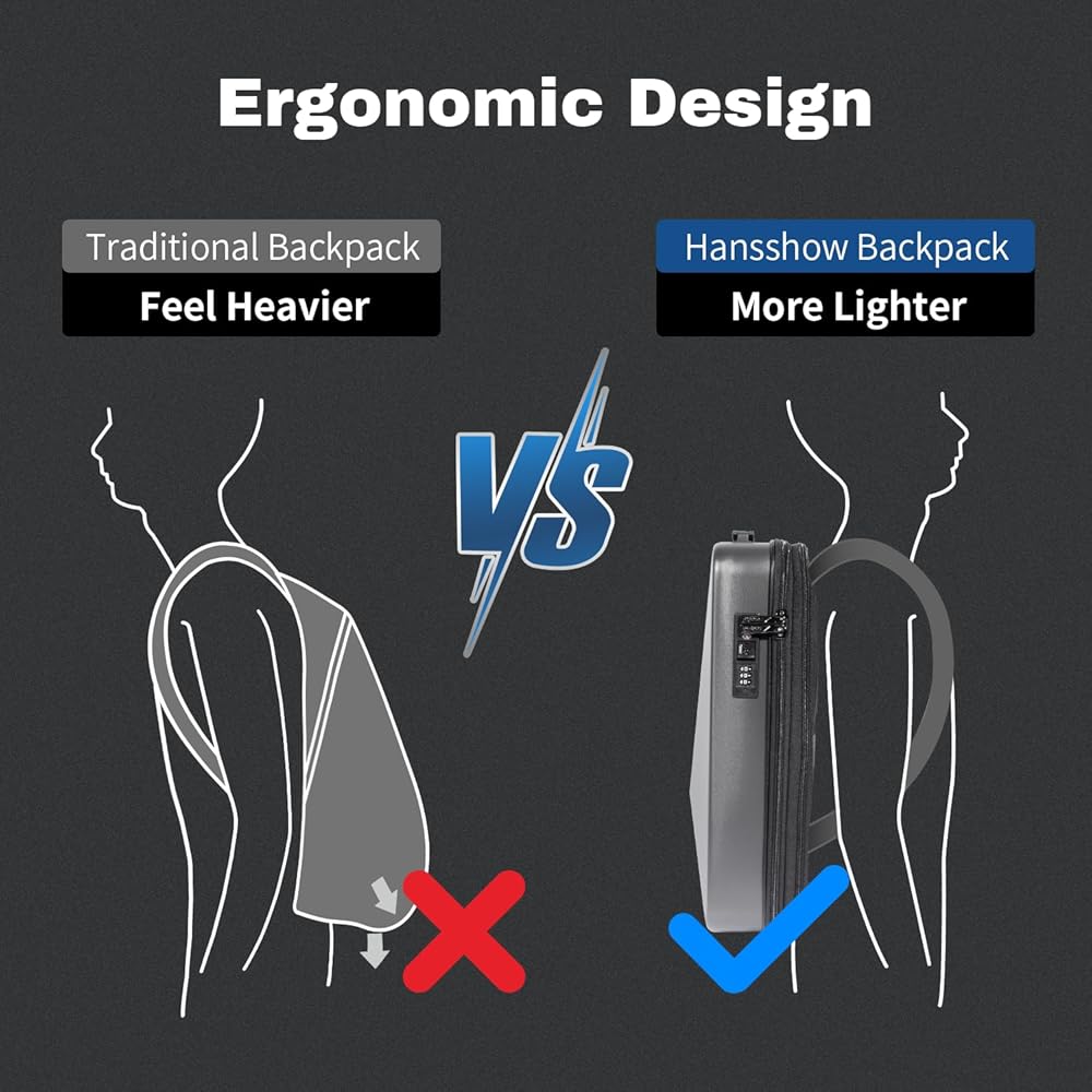 【Hansshow Hard Shell Laptop Backpack】Stay organized and protected with our Hansshow Hard Shell Laptop Backpack. This waterproof backpack is designed with a durable PC&ABS hardshell front that is both scratch-resistant and waterproof. The back is equipped with shock-absorbing pearl cotton to provide comfort and relieve pressure on your shoulders. Our custom lock ensures the safety of your valuable items, and the convenient USB ports allow for easy charging on the go.