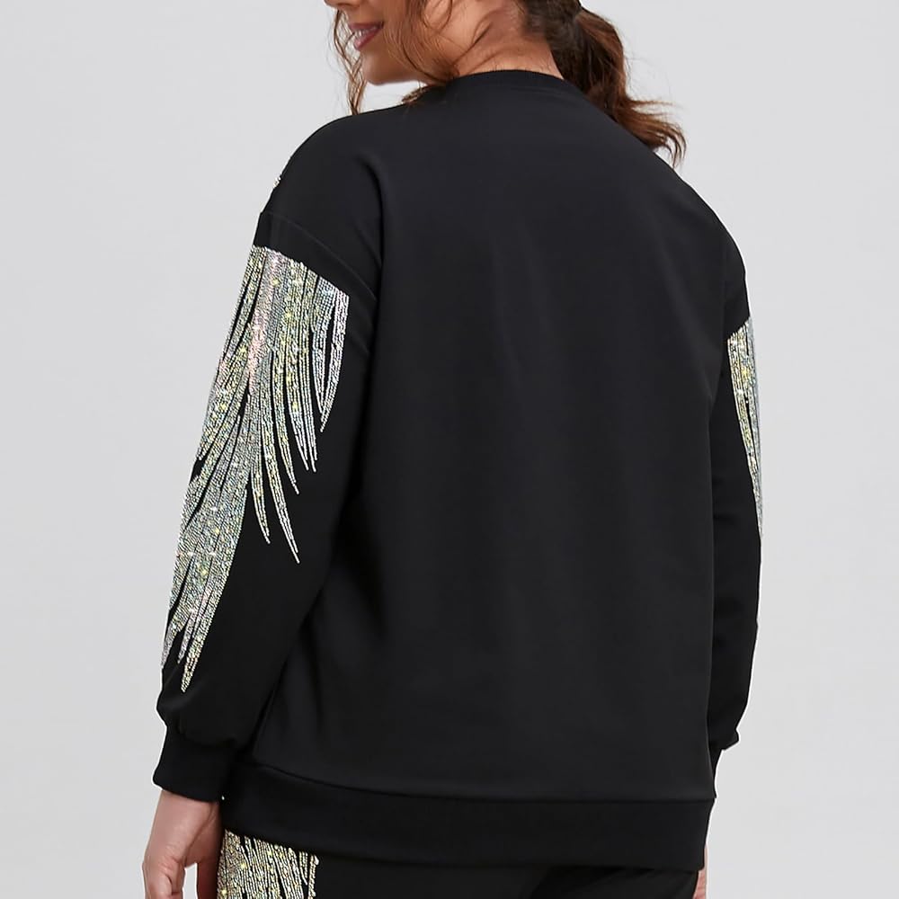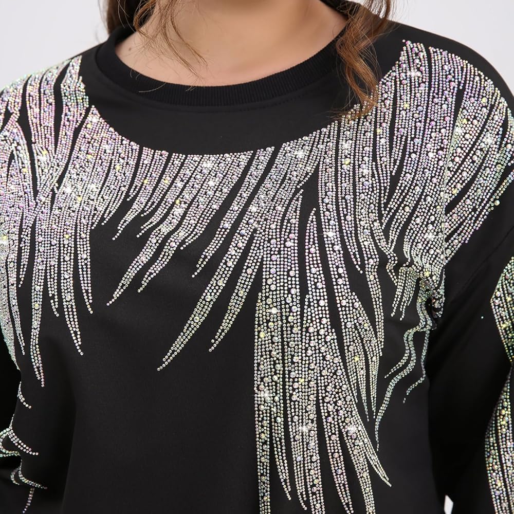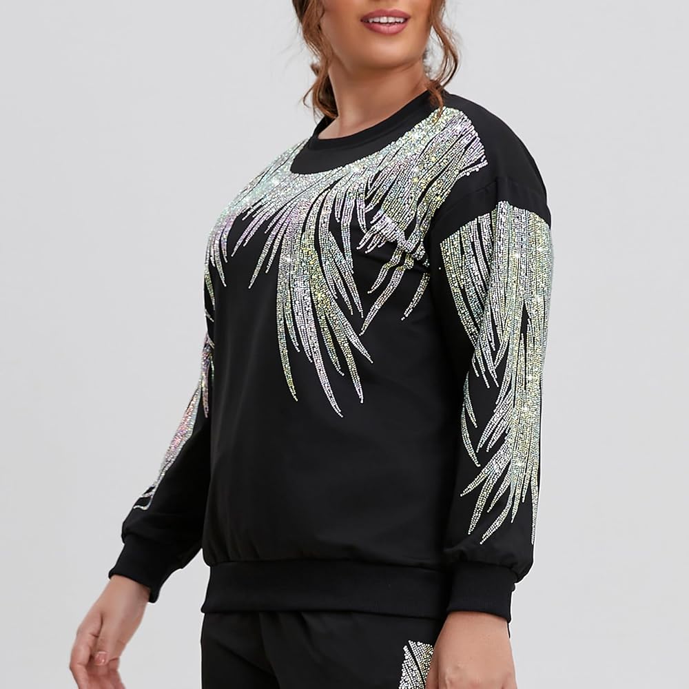 1. Sparkling Rhinestones: Our plus size crewneck sweatshirt women is adorned with sparkling rhinestones, adding a touch of glamour and elegance to your fall/winter wardrobe.