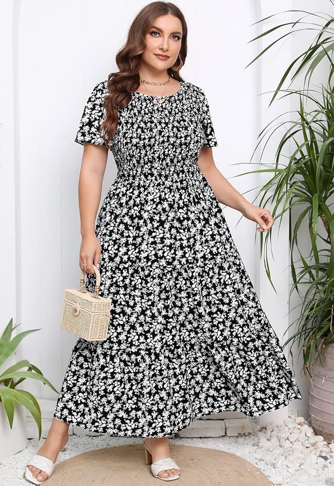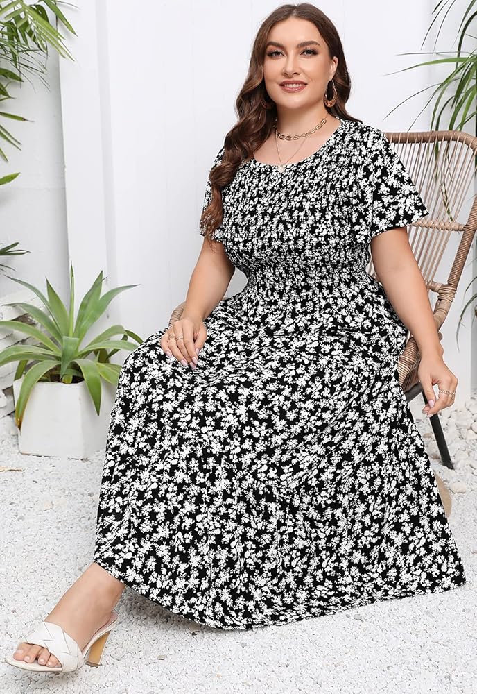 Casual Short Sleeve Elastic Waist Dress Plus Size Smocked Tiered Maxi Dress With Pockets Flutter Flowy Floral Bohemian Dresses Scoop Neck Summer Boho Dress With Pockets Cocktail Party Floral Dress Tiered Smocked Summer Sun Dress Loose Fitting Wedding Guest Maxi Dress
