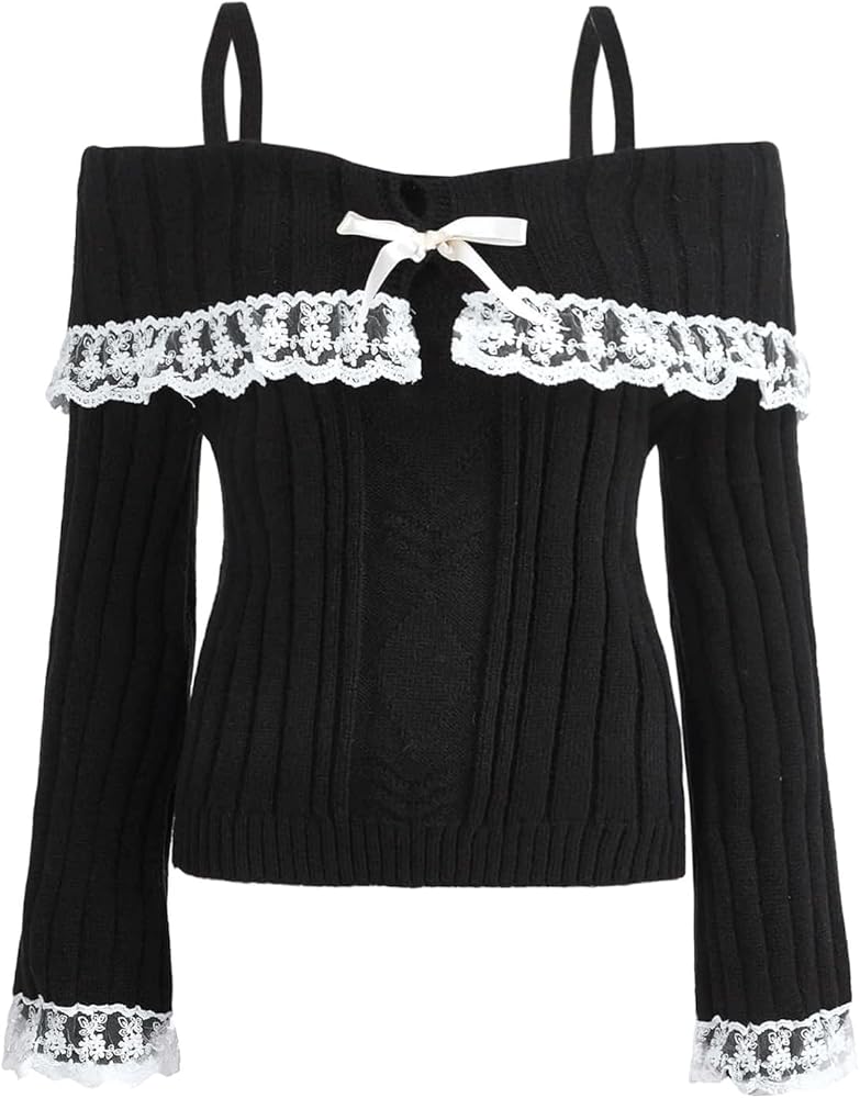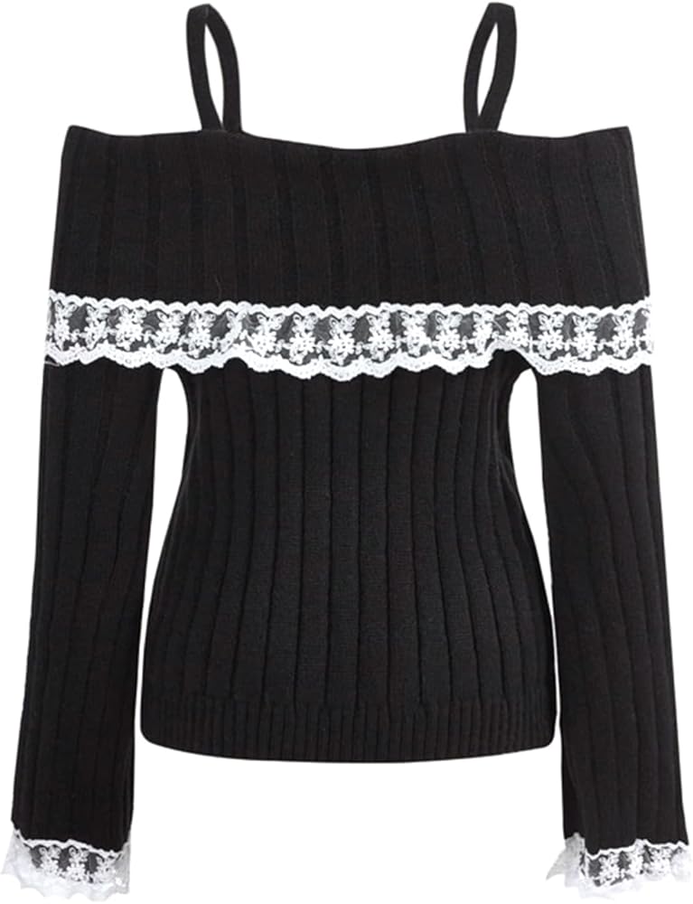Women Y2K Fairy Grunge Sweater Long Sleeve Slim Fit Star Pattern Knitted Pullover 2000s Fall Boat Neck Jumpers Top