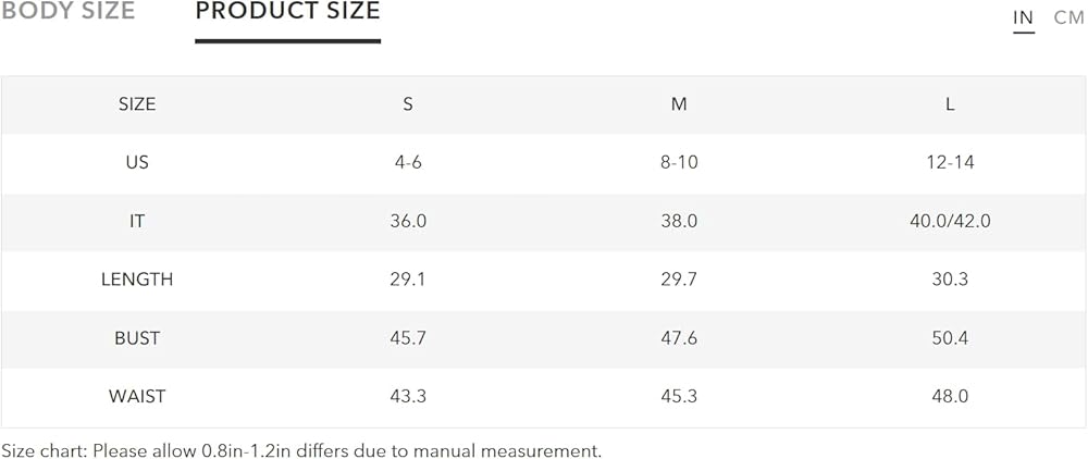 [Perfect Sizing]: Available in XS, S, M, L, XL. Please refer to our size chart for specific measurements to achieve the perfect fit.Model Wearing Size: Height: 5‘ in / 173 cm,Bust: 33.5 in / 85 cm,Waist: 23.5 in / 60 cm Hips: 35 in / 89 cm
