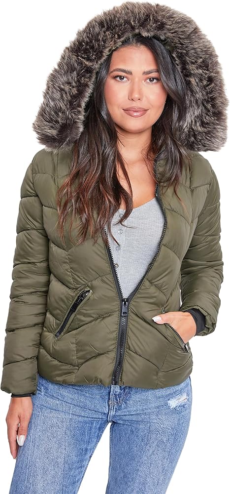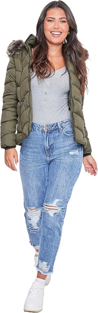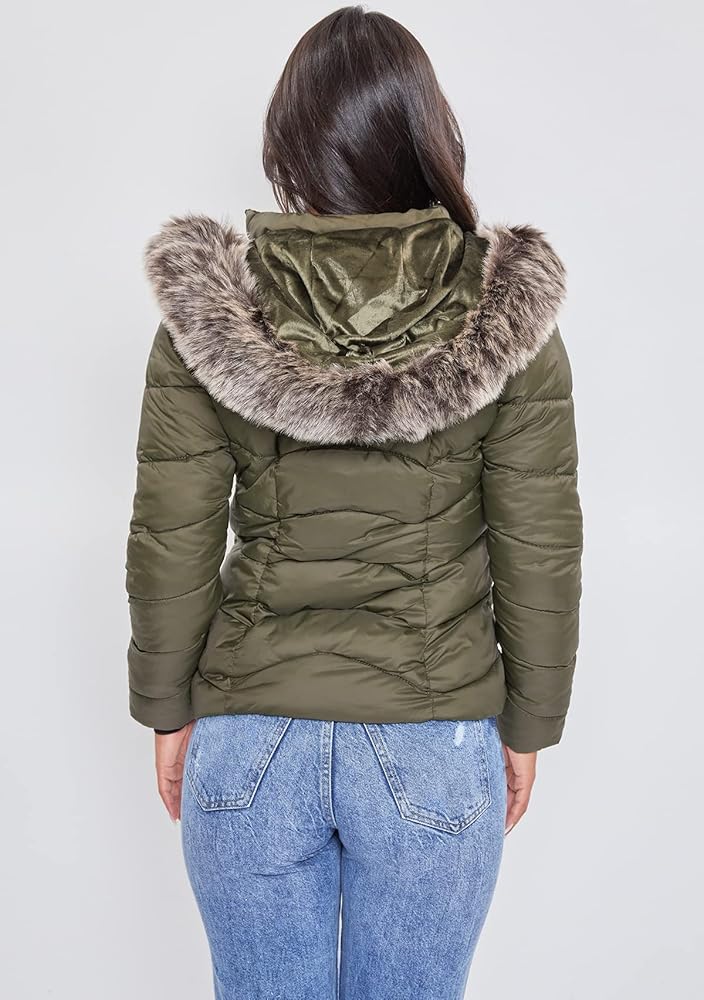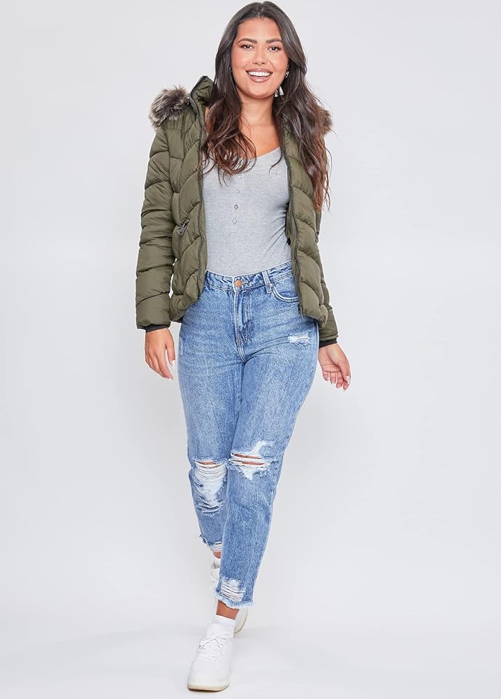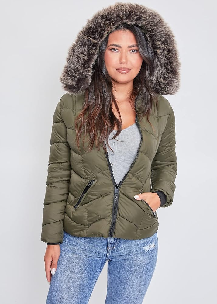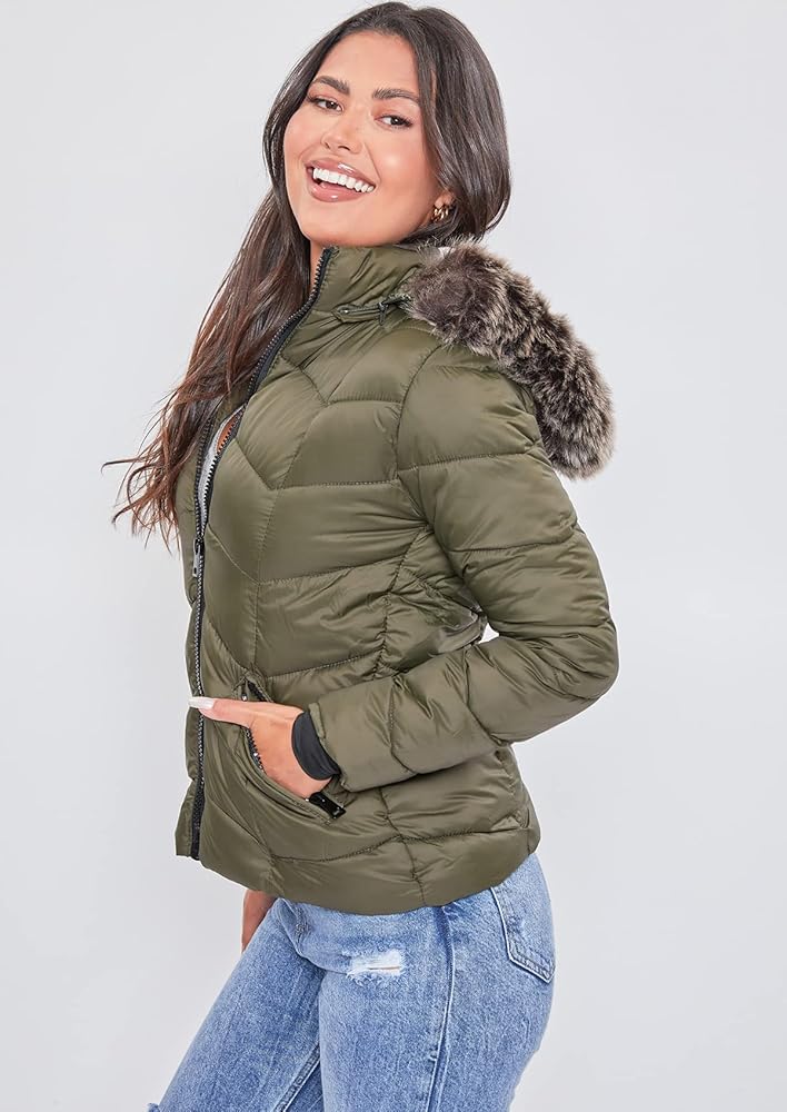 It is officially time to transition into fall/winter! Shop YMI Women's Juniors puffer jacket to find the perfect warm, slim-fitting jacket for your fall/winter outfits and busy days traveling. The women's puffer jacket features a detachable faux fur hood, a front zip closure, and two front zip closure pockets.