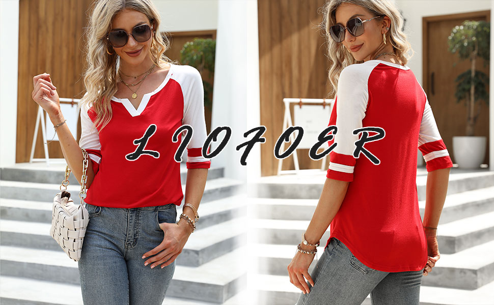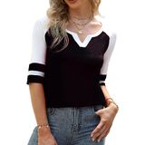 Women's 3/4 Sleeve T-Shirt V Neck Color Block Tops Loose Casual Blouse
