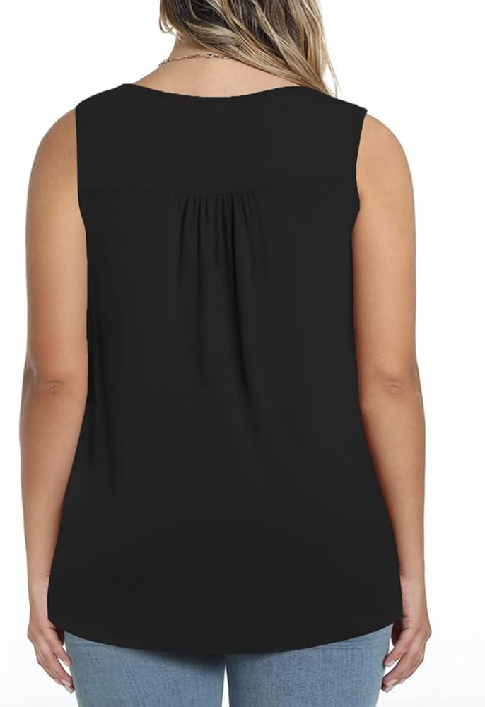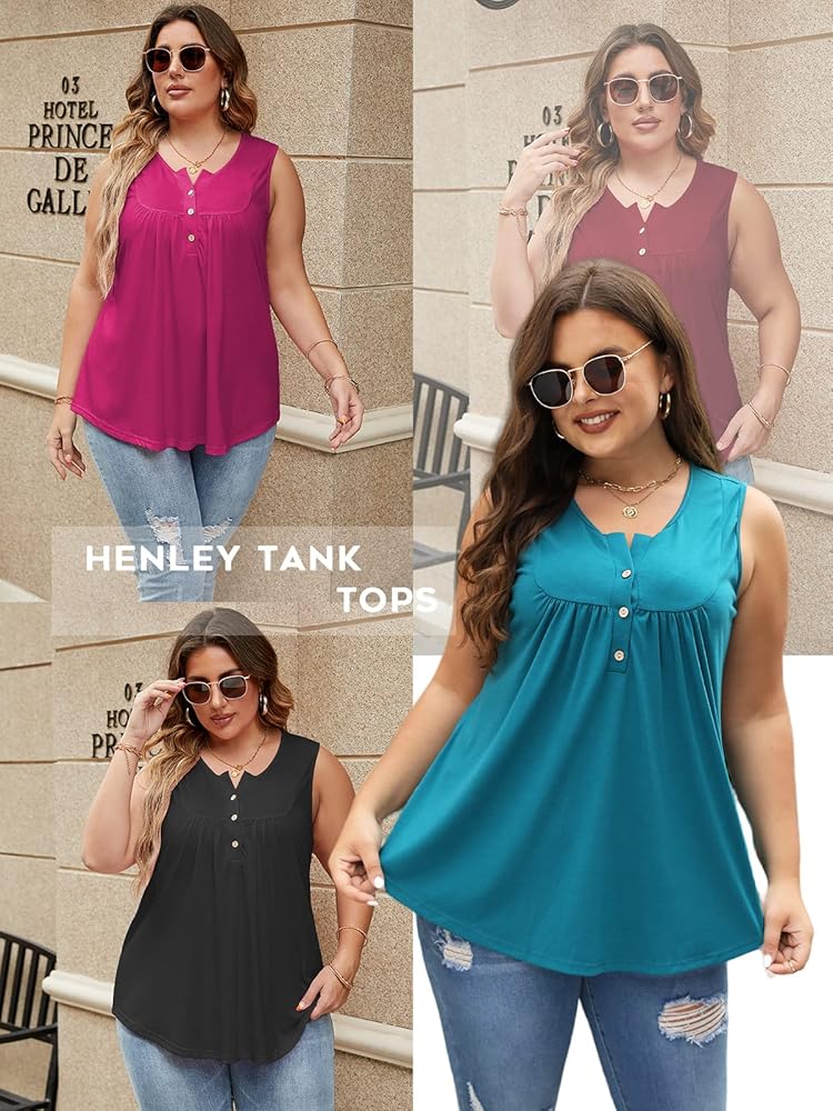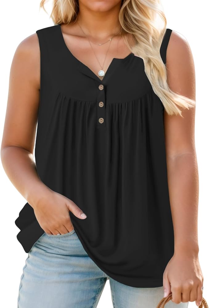 Womens plus size tank tops feature sleeveless and henley v neck with buttons, pleated in the front and back, show a casual and trendy look