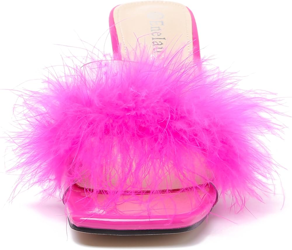 FEATURES: fluffy heels,square toe,open toe,lightweight,fluffy feather,backless slip on style,fashionable and comfortableclassic,fashion summer shoes,Fashion Square Open Toe suitable for daily wearing and vacation.Mule sandals are perfect for party,wedding,gown,nightclub,office,date,cocktail and other special occasions.
