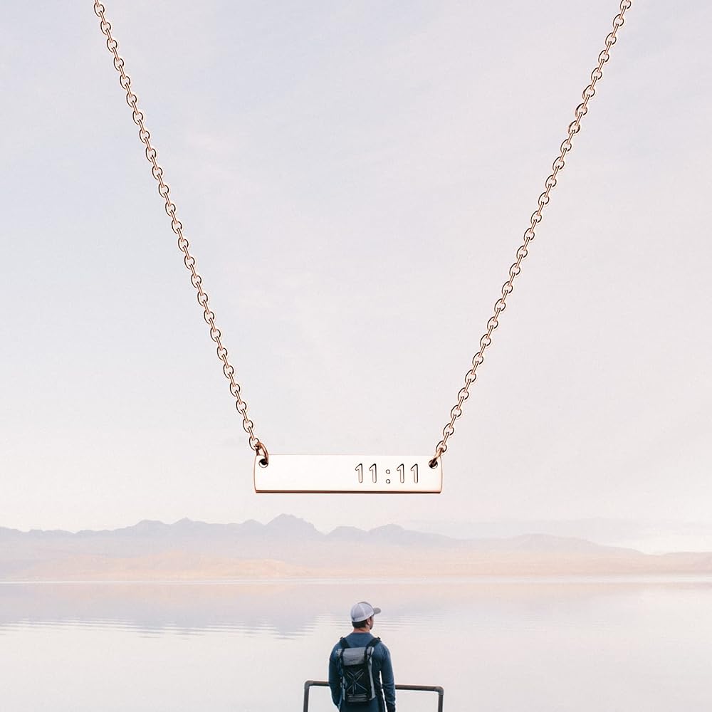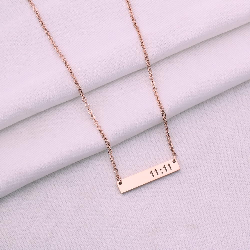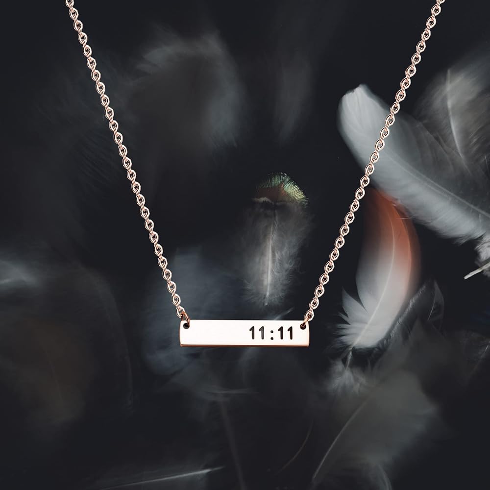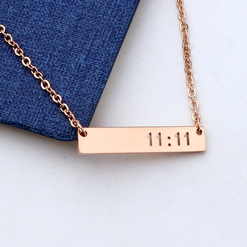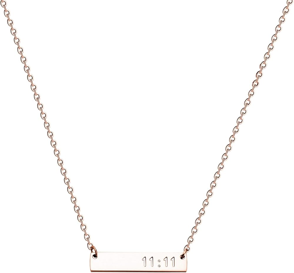 11:11 engraved bar 1.2 inch length, 3/5 inch width, stainless steel chain length 18 inch with 2 inch extensions.