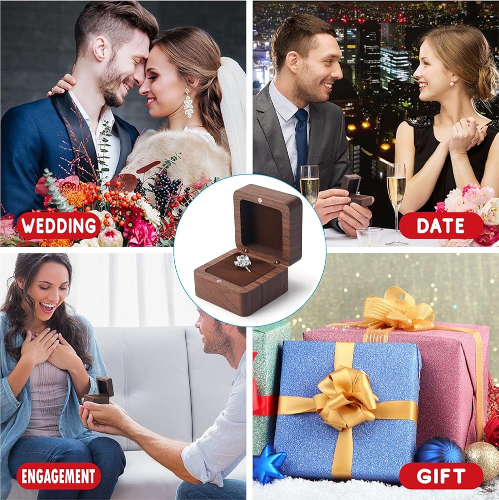 ➤COMWPACT SIZE DESIGN : The wedding ring box outside size 2.16” x 2.16” x 1.37 ”, This wooden ring box is small and easy to carry, and there is enough room here for most ring sizes, You could carry the engagement ring box in your pocket, perfect r gifts to give him/her a surprise!.Can also be used as a travel storage ring or trinket.