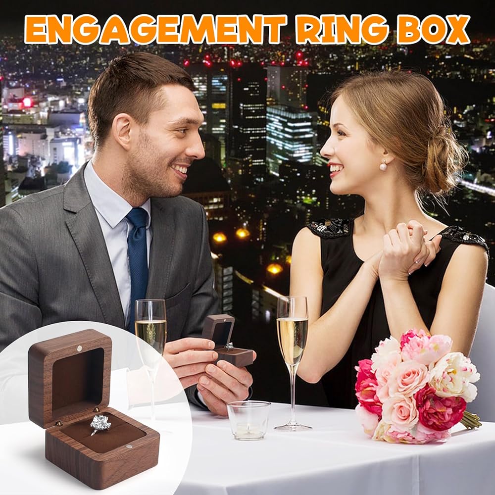 Personalized Wooden Ring Box, Engagement Ring Holder Box with 1 Slot, Wedding Ring Box for Proposal, Retro Wood Ring Bearer Box Jewelry Storage Case for Ceremony (Brown)