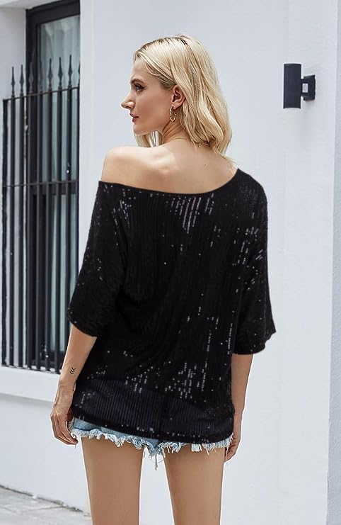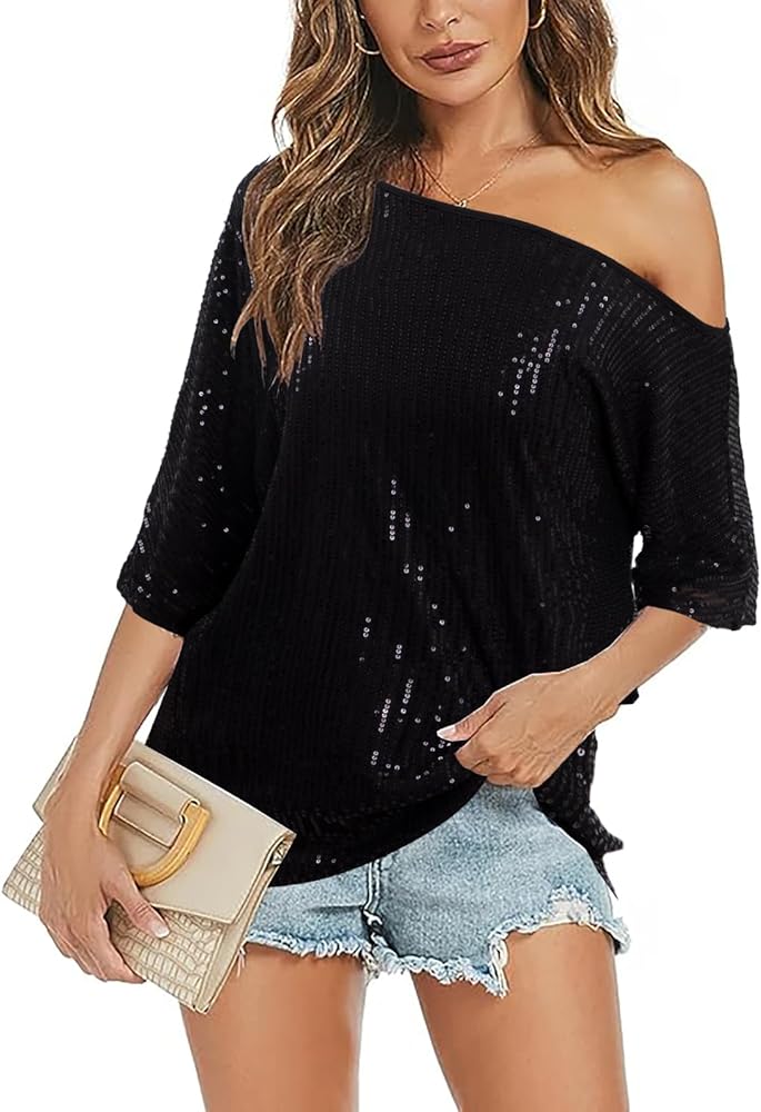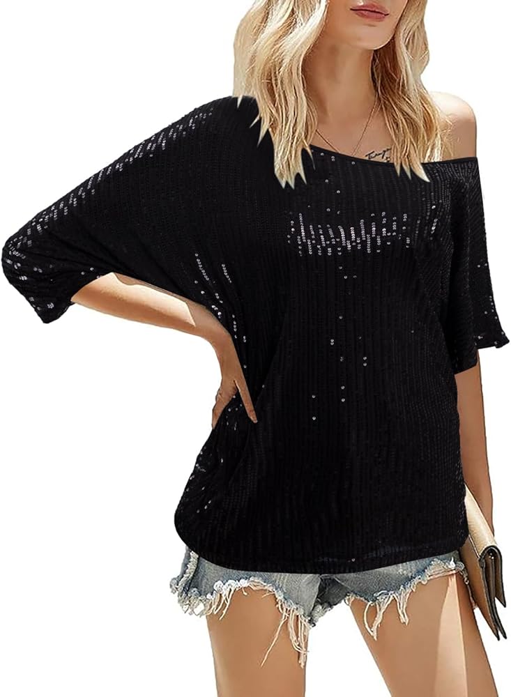 【FEATURES】 Off the shoulder top, casual short sleeve tops, sexy sequined tops for women, party club night blouses, fashion novelty sequin shirts, casual women's blouse tops, club night outfits, round neck t shirts for women loose fit.