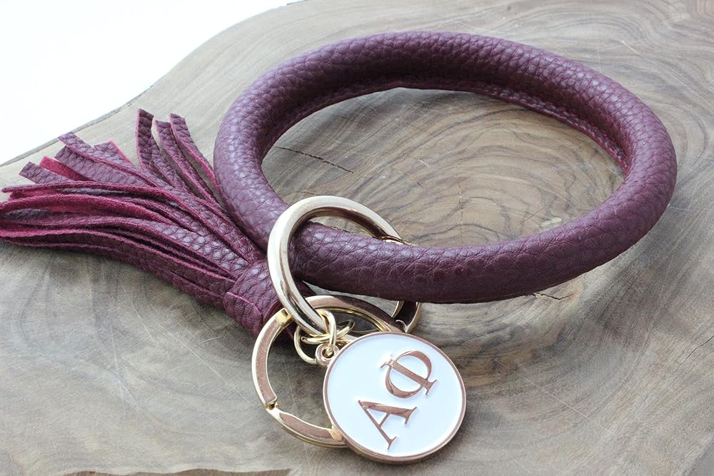 Sorority Shop is focused on providing the best sorority merchandise worldwide. Produced from high-quality material, the licensed sorority collection helps you celebrate sisterhood. Make a bold fashion statement and show your sorority spirit with our Sorority Bracelet Keychain. Our Sorority bangle keychains are perfect for the girl who's always got her hands full! Make your keys a new fashion accessory with this wristlet keychain that can be worn on your wrist or attached to your bag. Our bangle is vegan leather wrapped with a decorative tassel and hinged clasp ring for your keys and comes with a white pendant with your sorority letters in gold print. The AP Wristlet Keychain by Sorority Shop is the perfect gift for your sorority sisters and new members, whatever the occasion and is the perfect accessory to show your Sorority pride all year long! The sorority keychain is a perfect gift for women to showcase their love and friendship. Buy it for yourself or gift it to another sorority member for any occasion such as bid day, recruitment, big little, sorority events—the best souvenir for you and your friends.